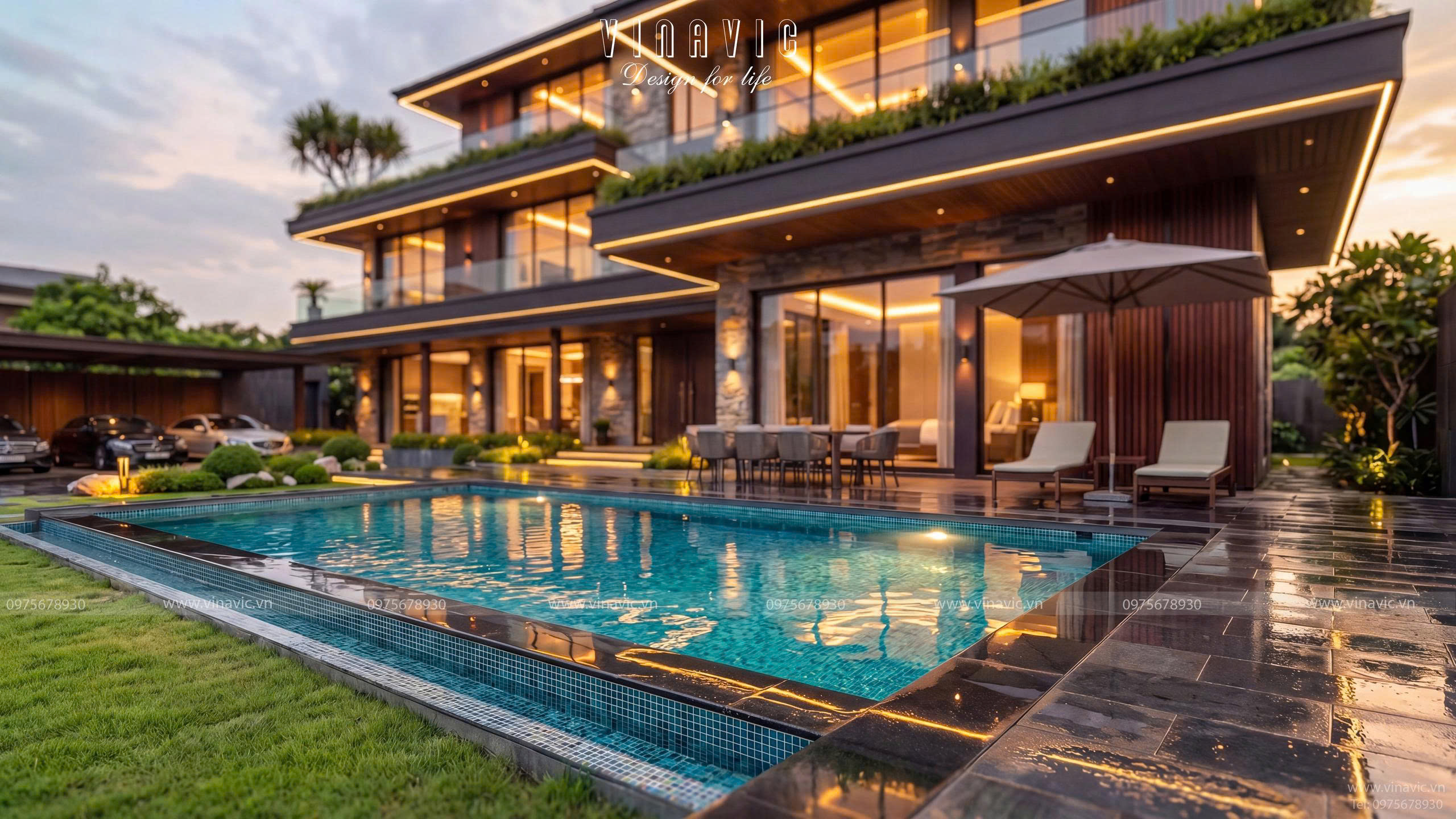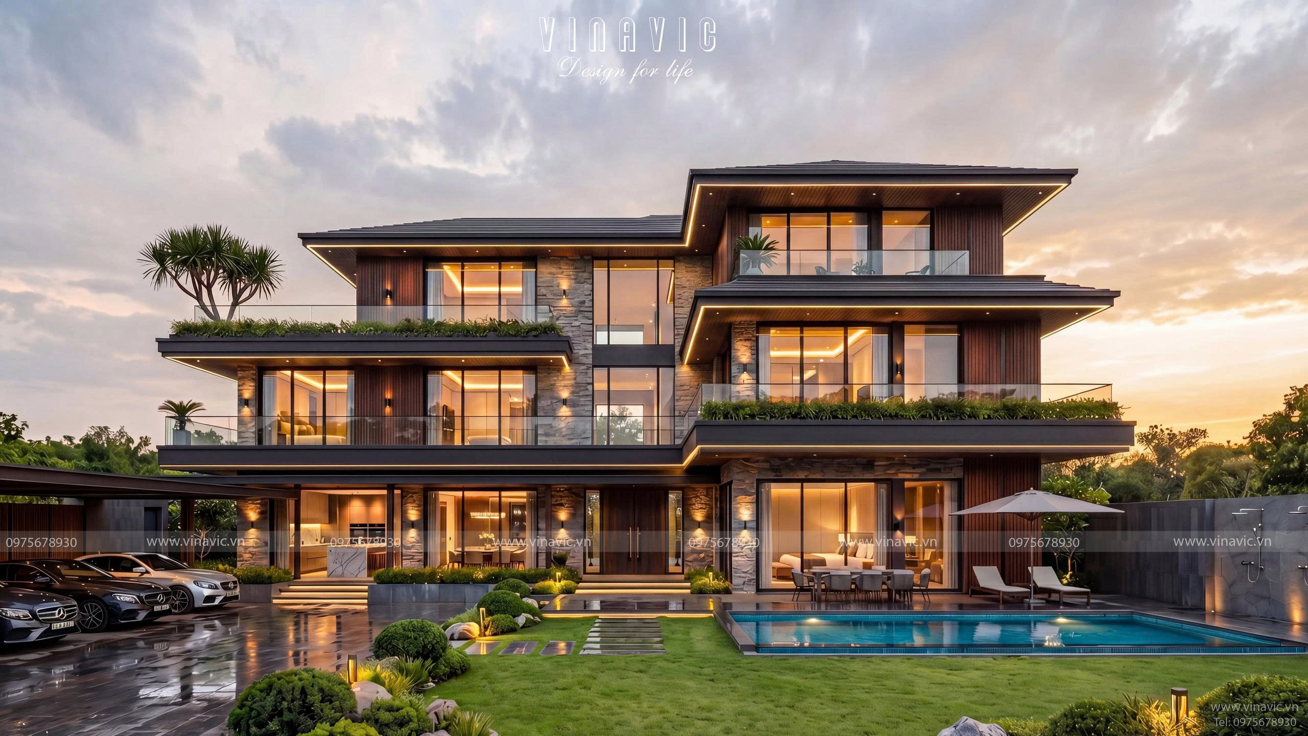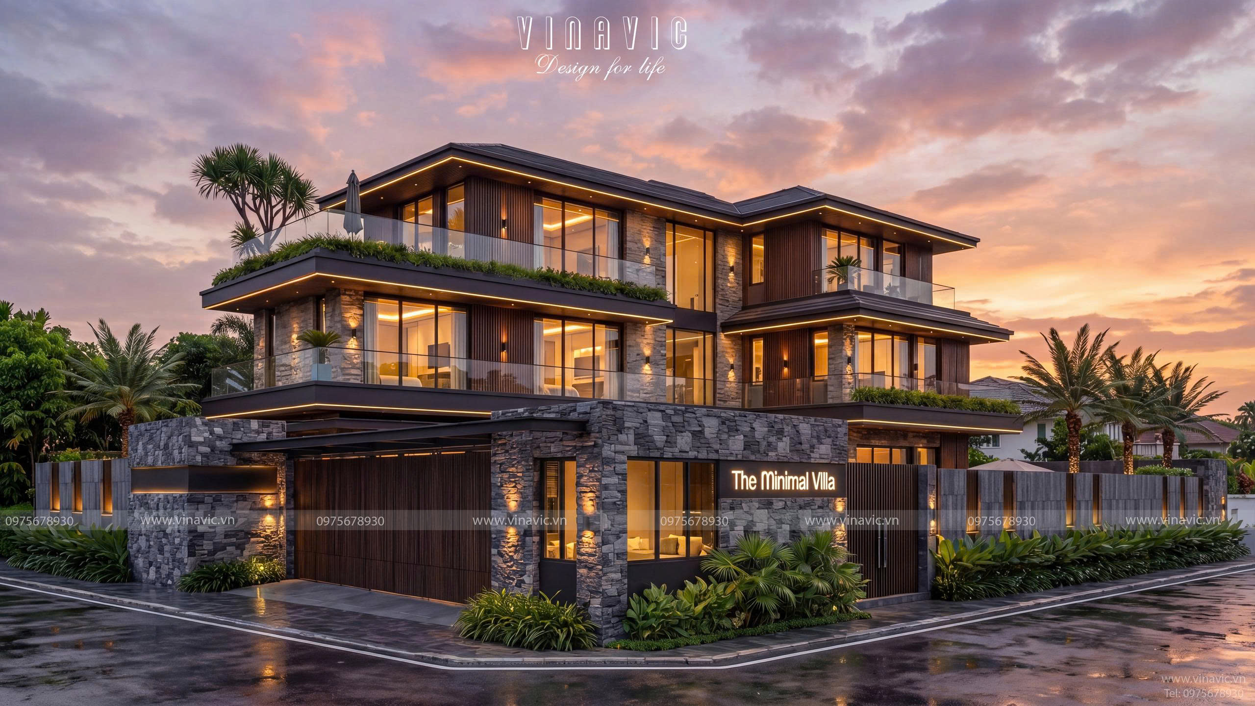 Căn biệt thự 3 tầng hình chữ nhật mang dấu ấn Modern Luxury với hệ hình khối ngang mạnh mẽ, các lớp không gian giật cấp cùng sự kết hợp tinh tế giữa đá, gỗ và kính, tạo nên tổng thể sang trọng, thời thượng. Không gian được tổ chức theo hướng mở, liên kết phòng khách, bếp, sân vườn một cách liền mạch, vừa mở rộng trải nghiệm sống, vừa khai thác tối đa ánh sáng tự nhiên.