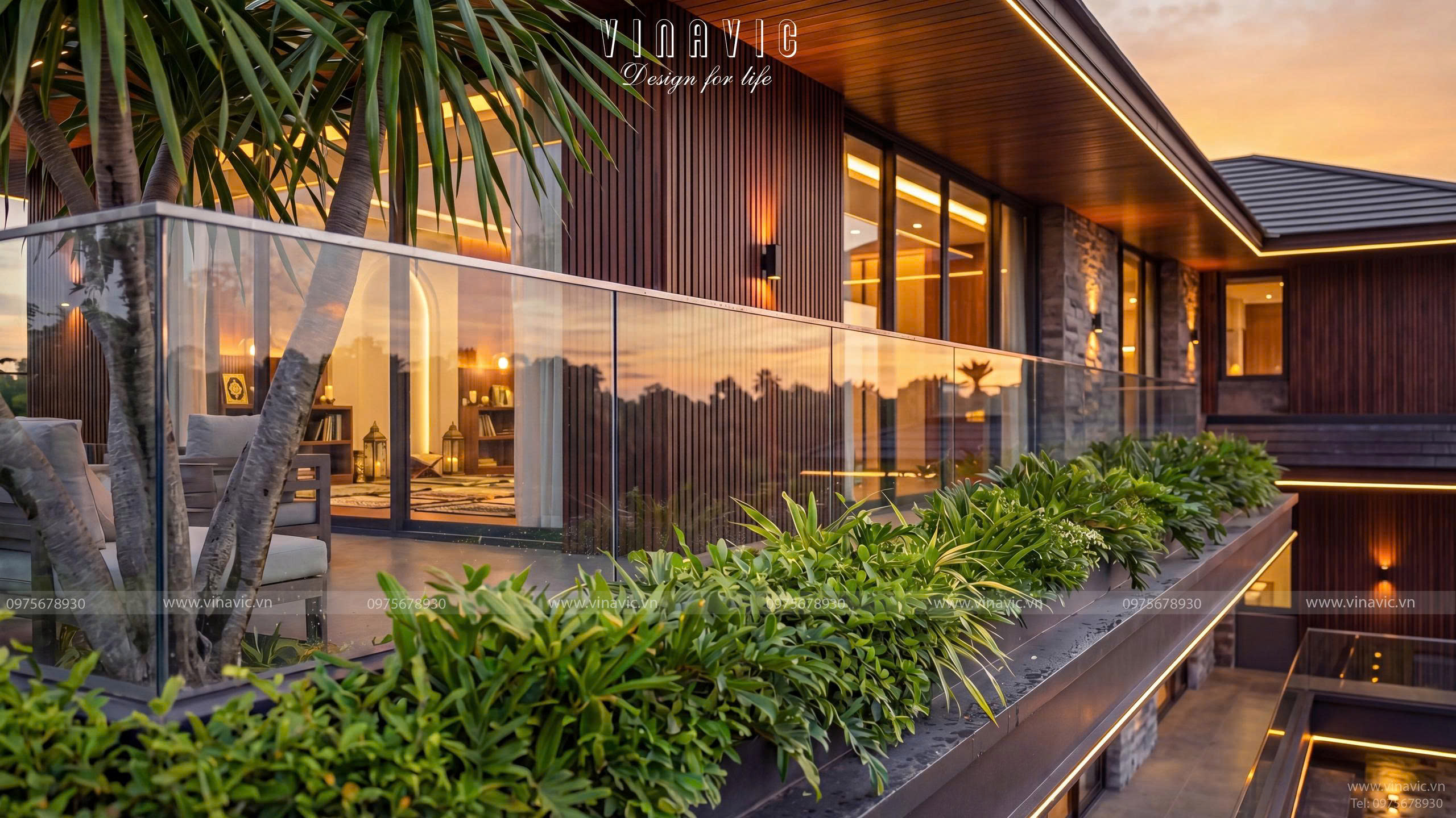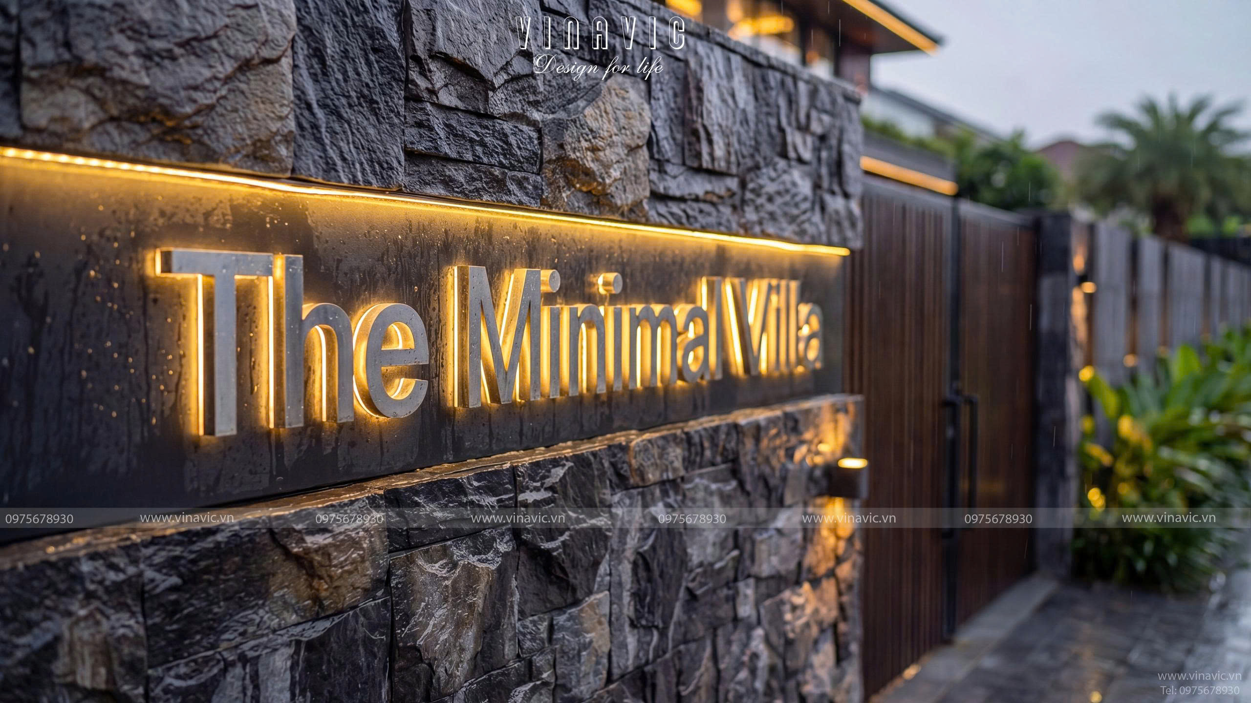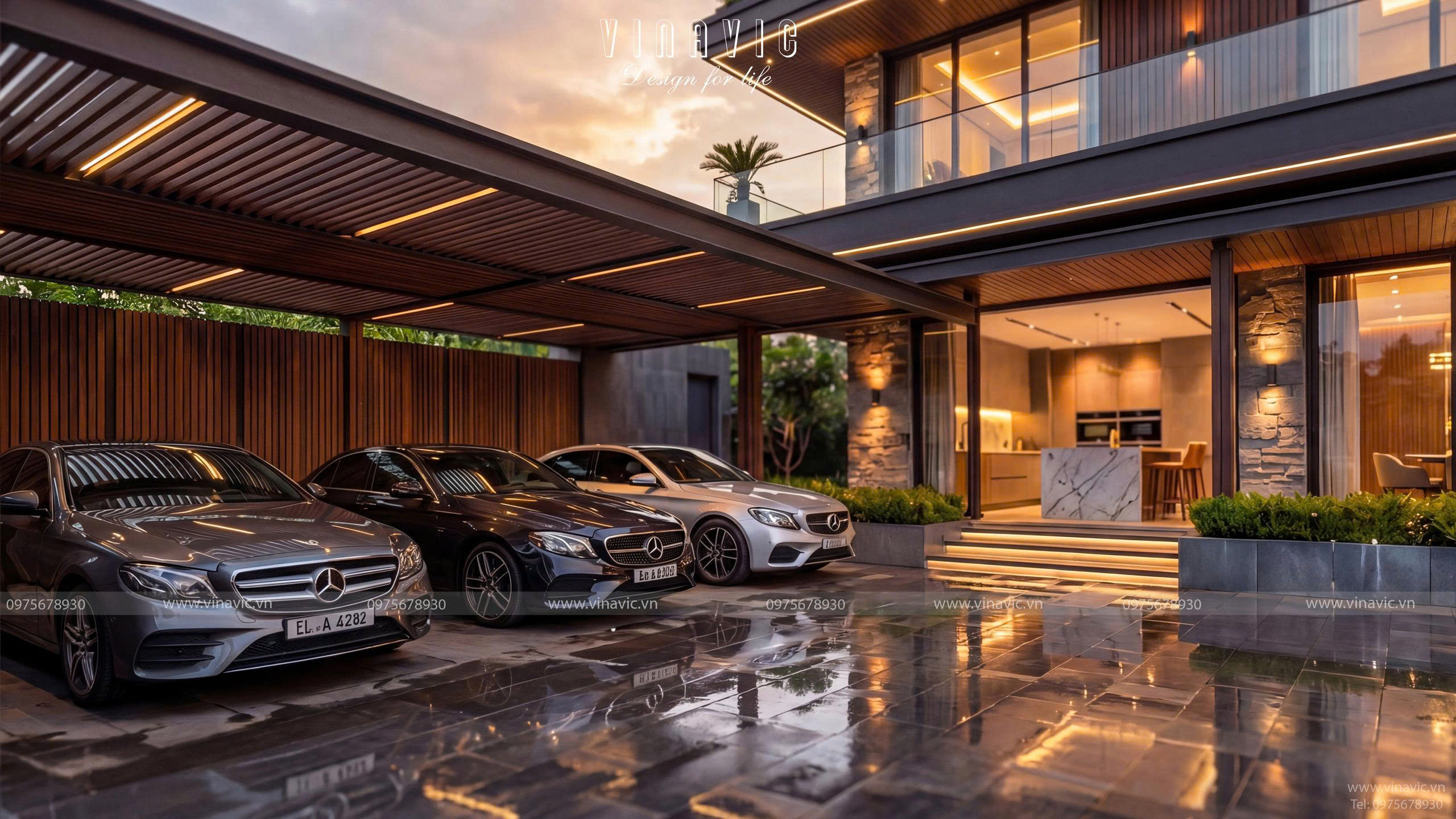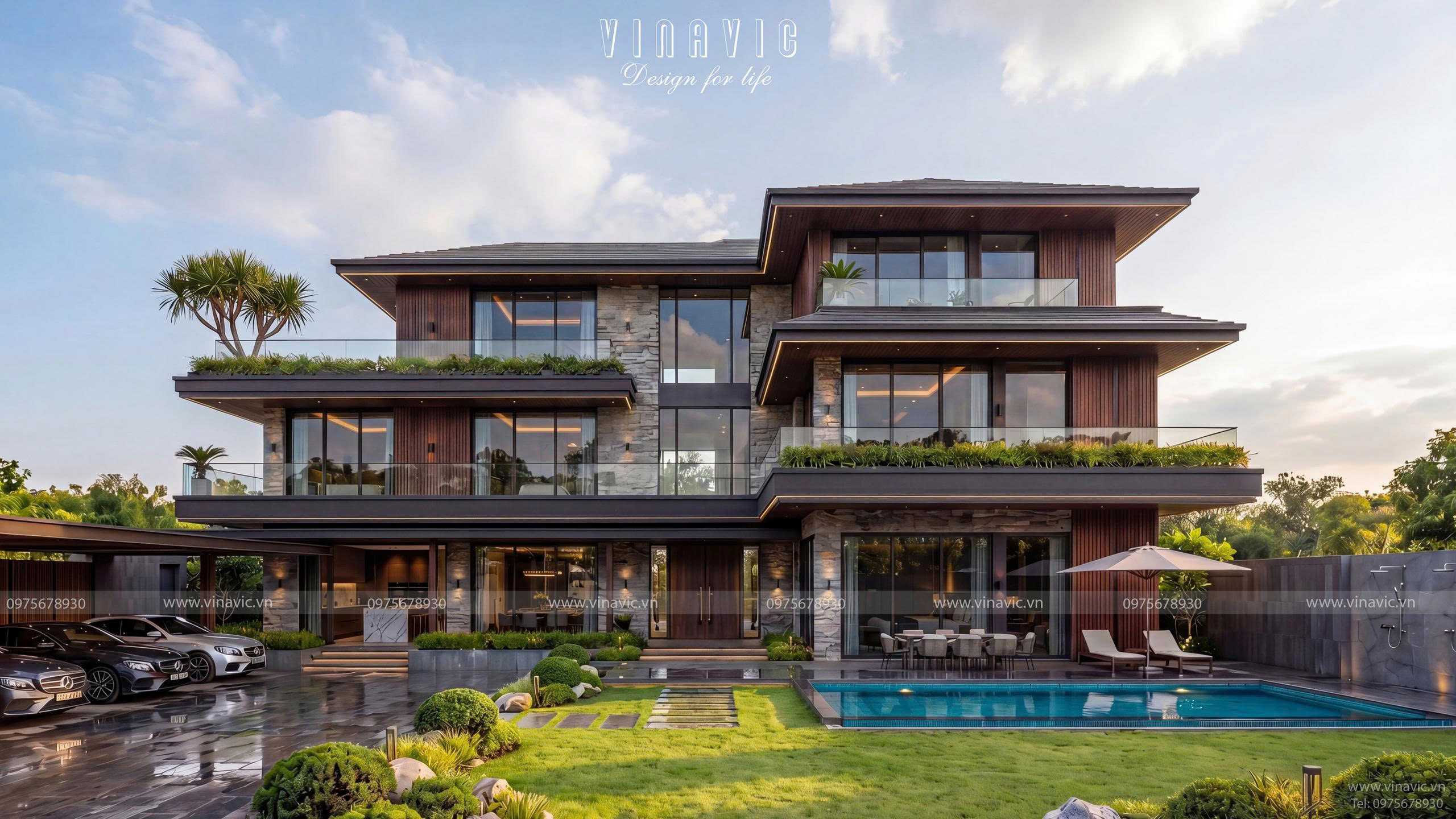 Căn biệt thự 3 tầng hình chữ nhật mang dấu ấn Modern Luxury với hệ hình khối ngang mạnh mẽ, các lớp không gian giật cấp cùng sự kết hợp tinh tế giữa đá, gỗ và kính, tạo nên tổng thể sang trọng, thời thượng. Không gian được tổ chức theo hướng mở, liên kết phòng khách, bếp, sân vườn một cách liền mạch, vừa mở rộng trải nghiệm sống, vừa khai thác tối đa ánh sáng tự nhiên.