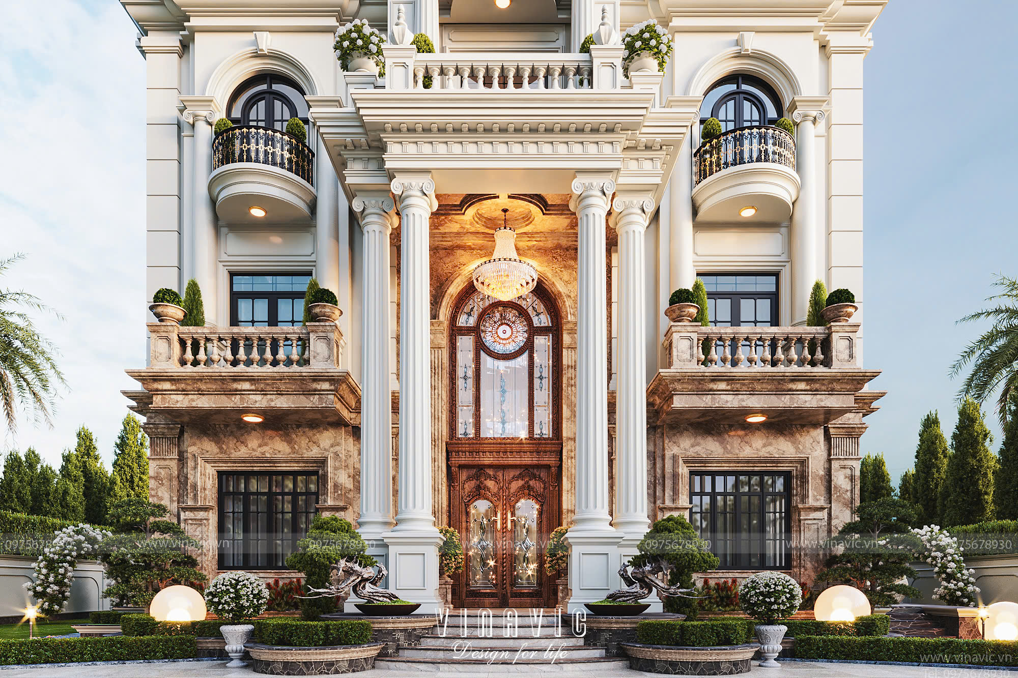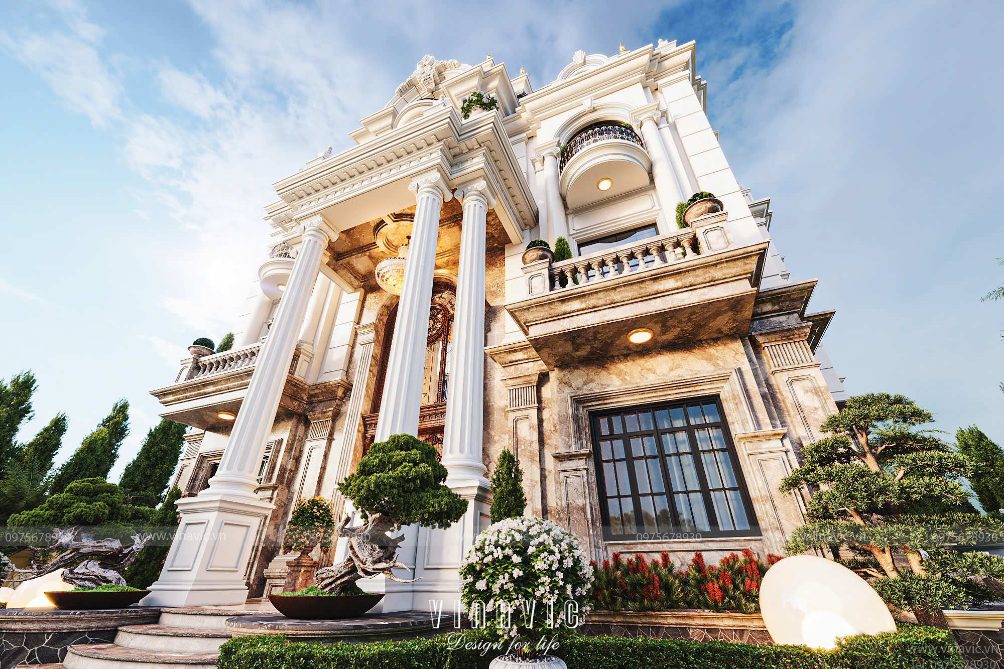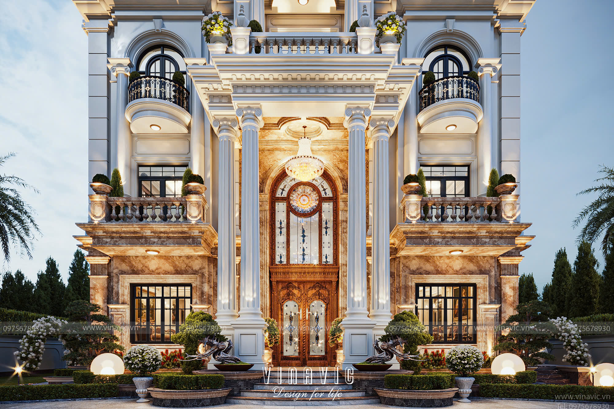 Lầu 1, Lầu 2: Đây là nơi phô diễn vẻ đẹp hoa mỹ nhất. Khối thân sơn màu trắng kem tinh khôi, làm nổi bật các chi tiết phào chỉ, hoa văn. Điểm nhấn đắt giá là hệ cột tròn La Mã (Roman columns) thông tầng, vươn cao nâng đỡ ban công lầu 2, tạo nên một loggia (sảnh) cực kỳ hoành tráng. Hệ cửa sổ chuyển sang dạng vòm cong mềm mại, lãng mạn.
