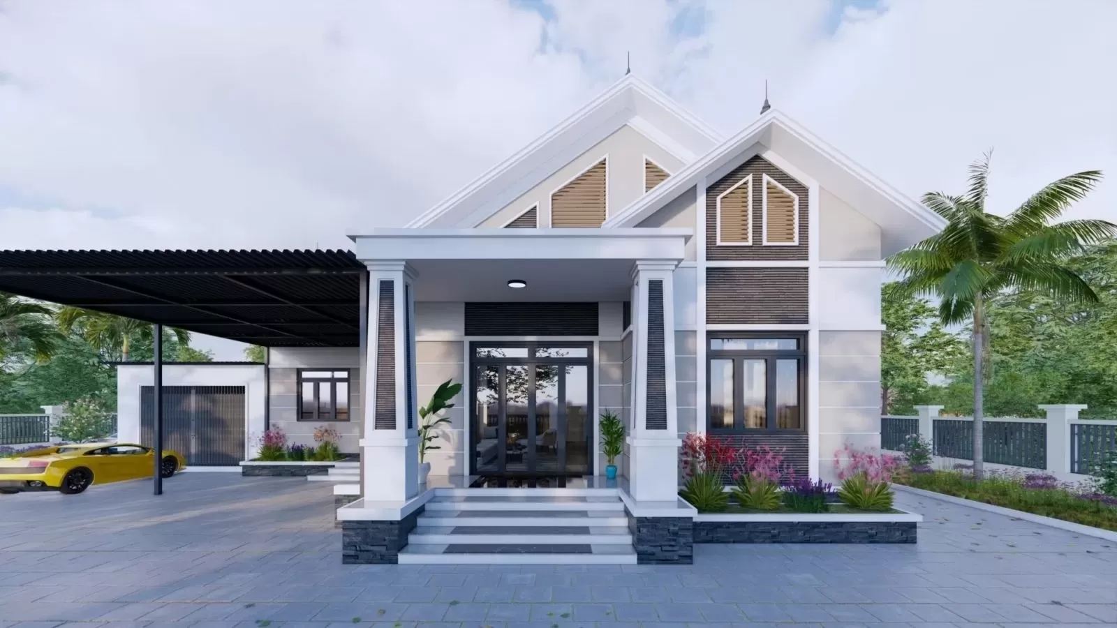 Mẫu thiết kế nhà 1 tầng sân vườn gần gũi thiên nhiên nổi bật bởi hệ thống 2 sảnh. Phần sảnh chính và sảnh phụ gây ấn tưởng với hệ cột bê tông chắc chắn cùng thiết kế vòm, phần mái thái phía trên rất đẹp mắt. Trong đó phải kể đến phần cửa chính được tạo hình bằng những ô cửa thoáng hình vòm đồng điệu và cuốn hút giúp ánh sán, gió trời lưu thông tối đa trong nhà.
