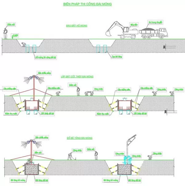 Sử dụng máy đào kết hợp nhân công để thi công hố móng, giằng móng theo bản vẽ kỹ thuật.