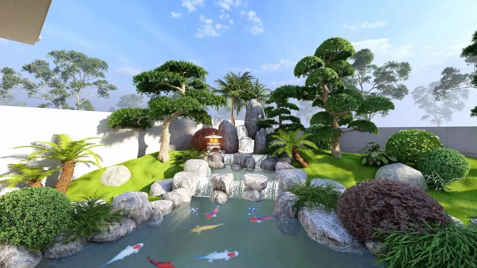 Tiểu cảnh nước: Sử dụng những yếu tố như hồ cá, đài phun nước hay những thác nước mini cho sân thượng để tạo cảm giác yên bình mát mẻ.