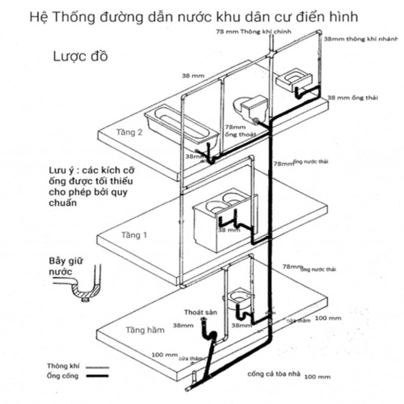 Sơ đồ cấp thoát nước nhà tầng cơ bản cần có những đường ống đảm bảo an toàn, đúng quy định kích thước đường kính ống. Hệ thống này cần có thiết kế khoa học và đảm bảo những tiêu chuẩn khi thiết kế hệ thống như cần có độ nghiêng, có ống thông khí,....