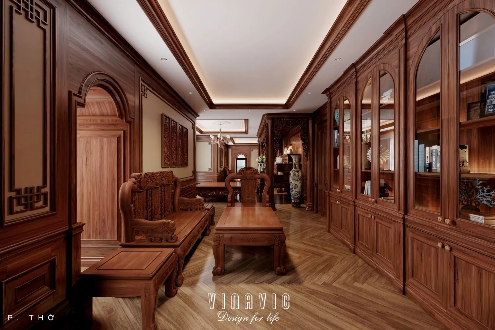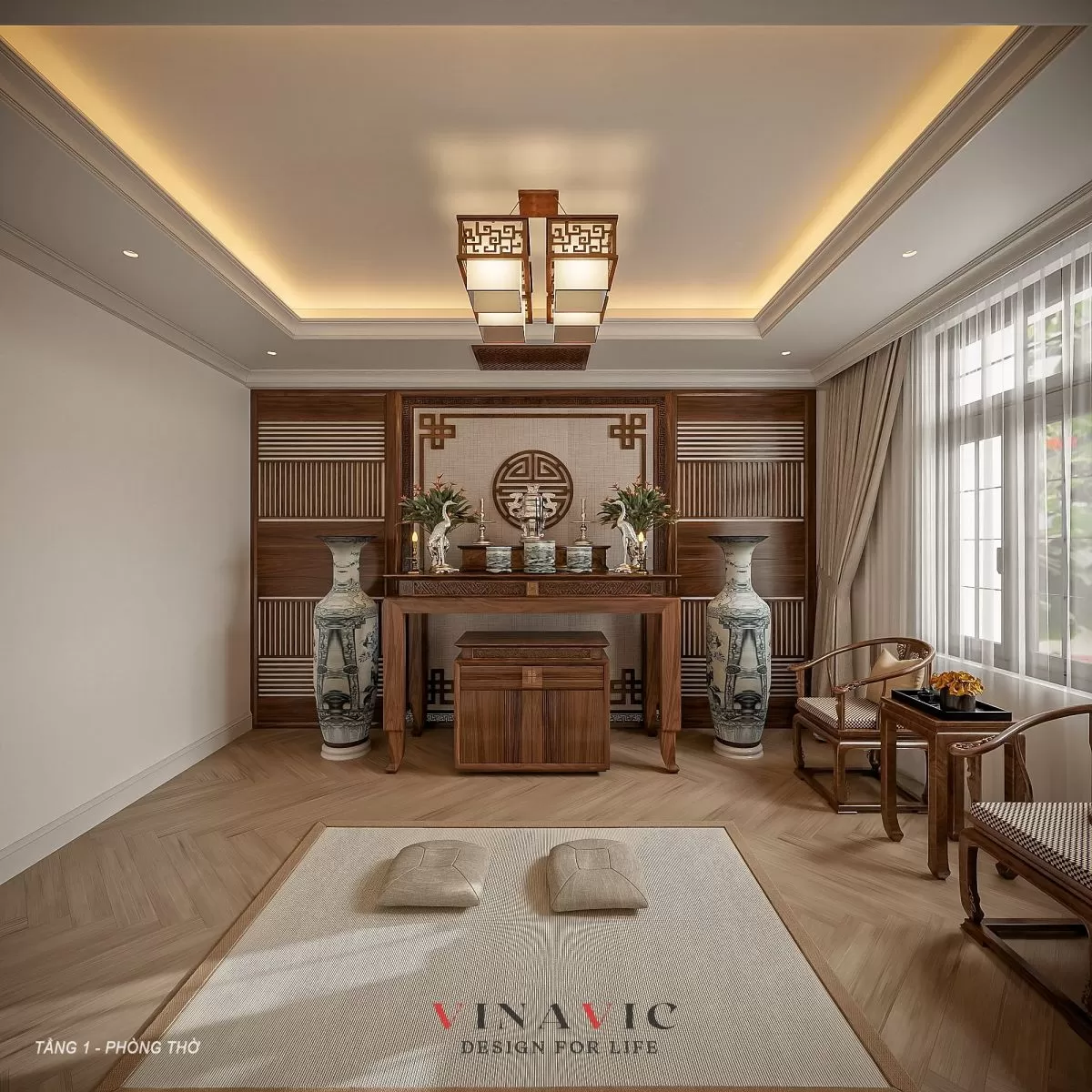 Phòng thờ trong biệt thự được đặt ở vị trí trang trọng, yên tĩnh và đảm bảo phong thủy tổng thể. Thiết kế ưu tiên sử dụng chất liệu truyền thống như gỗ tự nhiên, kết hợp hệ thống chiếu sáng nhẹ nhàng, tạo nên sự tôn nghiêm nhưng không nặng nề.