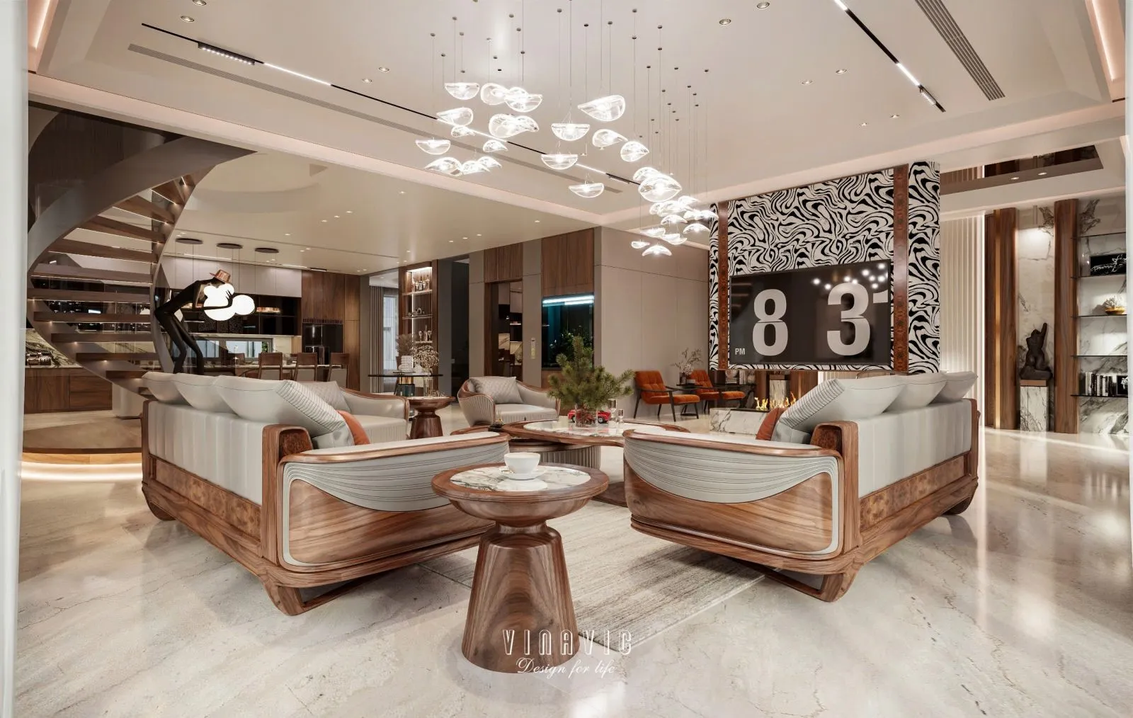 Thiết kế phòng khách biệt thự chú trọng vào sự mở thoáng, ánh sáng tự nhiên và tỷ lệ khối hài hòa. Các mảng vật liệu như đá tự nhiên, gỗ cao cấp, kính cường lực được phối hợp tinh tế, tạo nên một không gian vừa sang trọng vừa gần gũi nơi mọi cuộc trò chuyện trở nên trọn vẹn hơn.