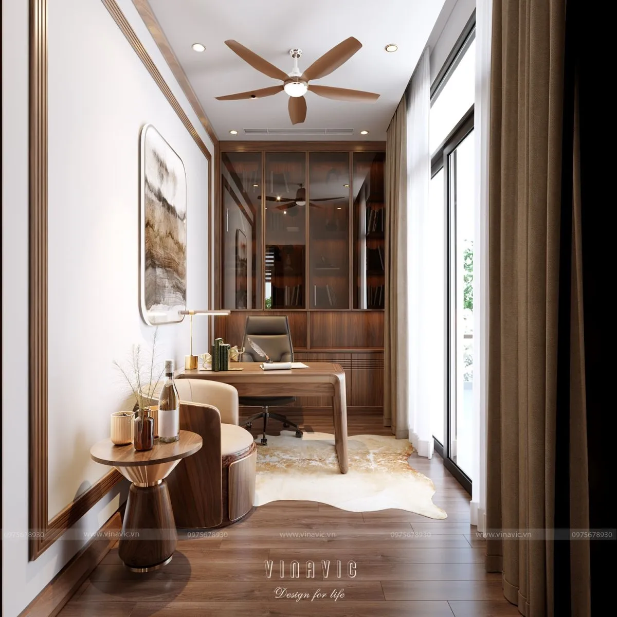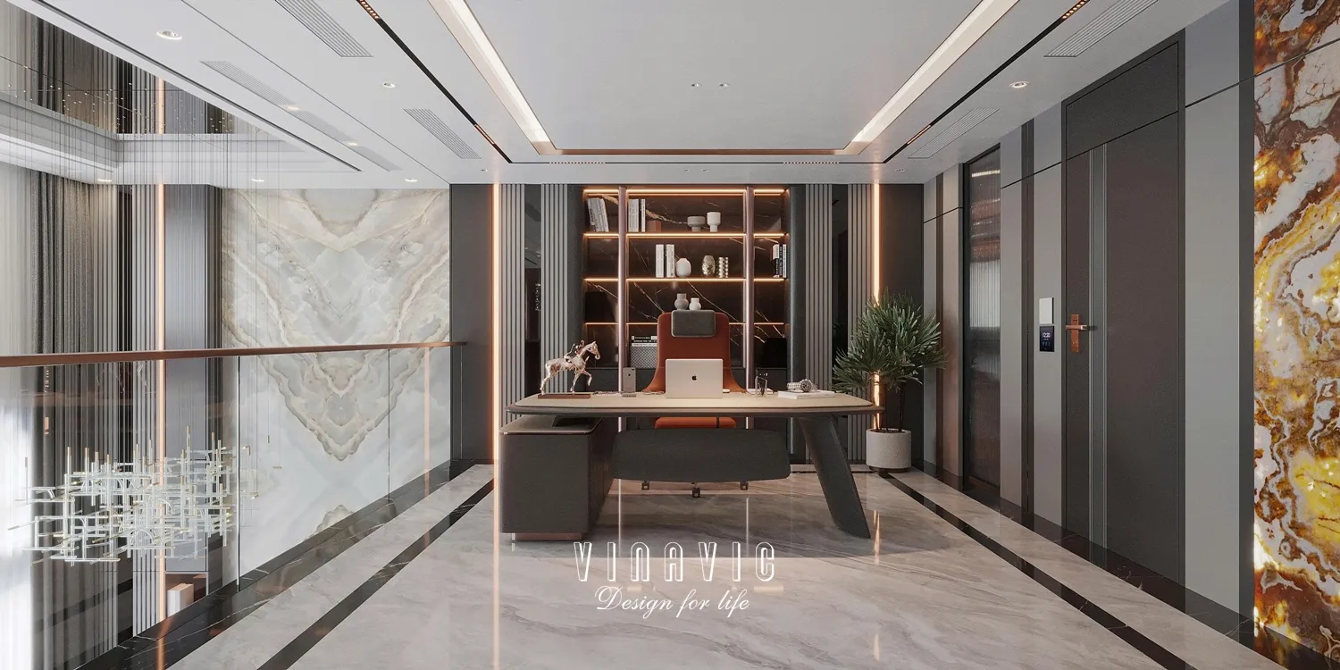 Thiết kế ưu tiên ánh sáng tự nhiên, góc nhìn đẹp và không khí yên tĩnh – tạo điều kiện tối ưu cho sự tập trung và hiệu suất cao. Bàn làm việc thường được đặt cạnh cửa sổ lớn hoặc ban công, kết hợp với hệ giá sách, tủ hồ sơ được bố trí gọn gàng, khoa học.