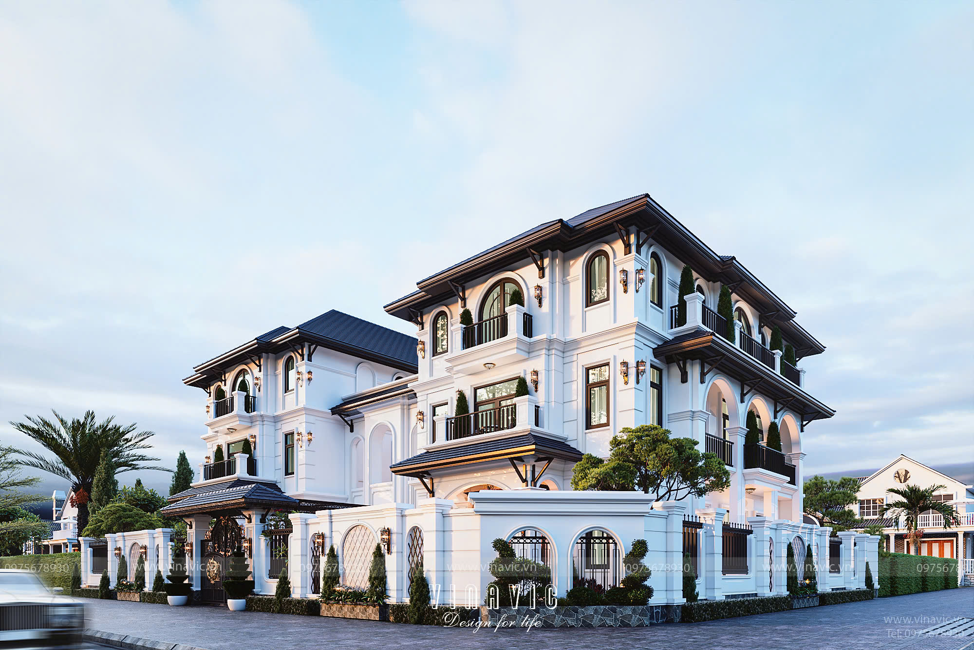 Công trình được tổ hợp từ hai khối biệt thự đối xứng, liên kết bằng sảnh trung tâm mái vòm, tạo nên bố cục đăng đối – bề thế – uy nghi. Đây là thủ pháp kiến trúc thường gặp trong các biệt thự châu Âu, giúp công trình vừa hoành tráng vừa cân bằng về thị giác.
