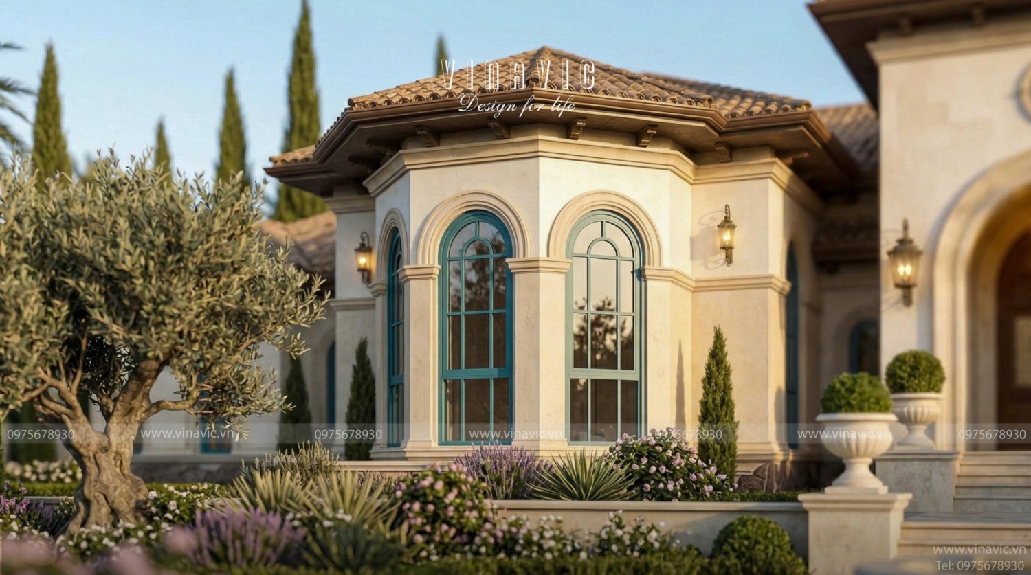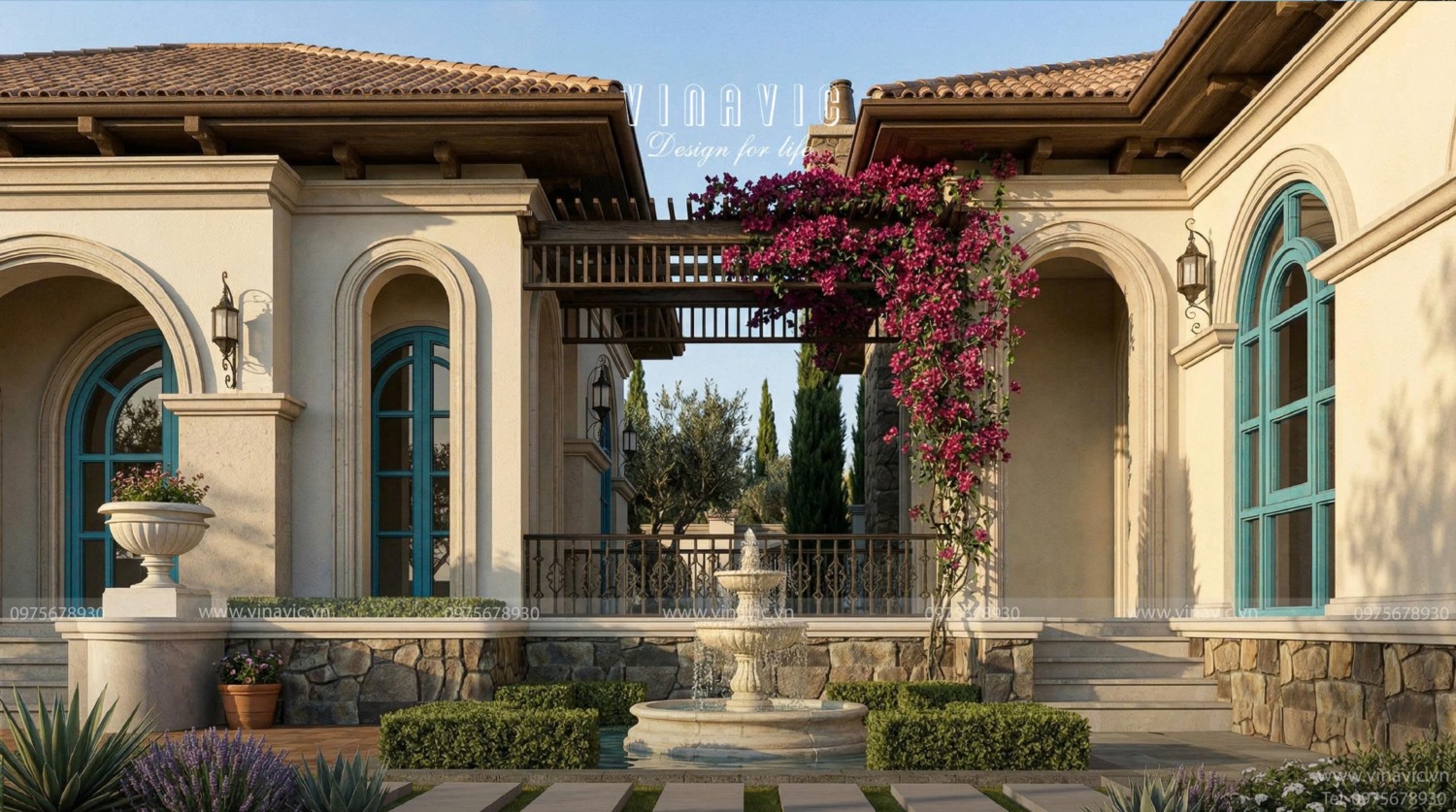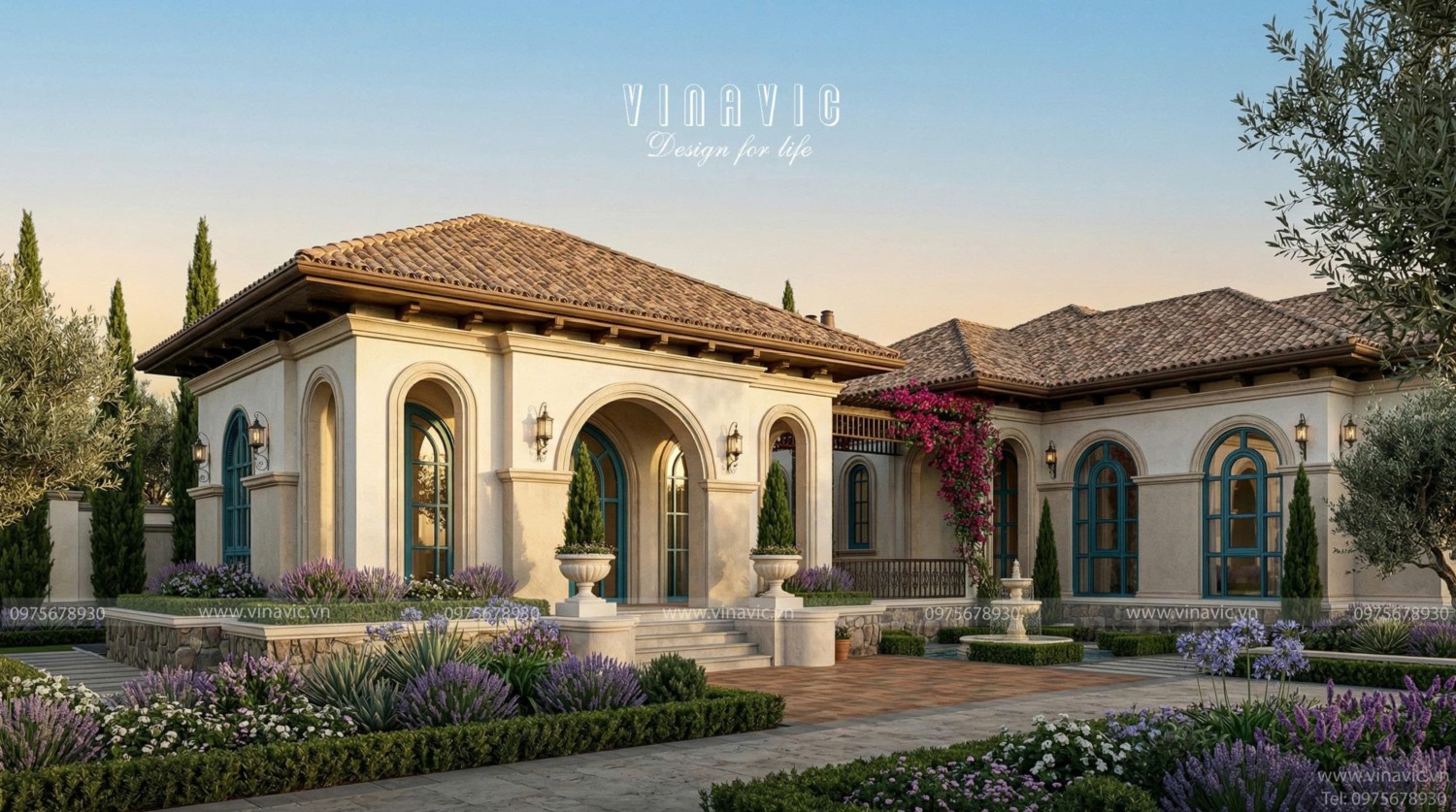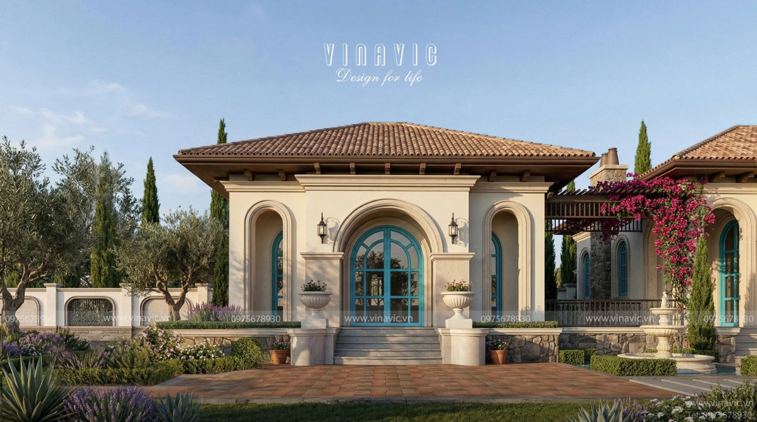 Biệt thự 1 tầng Sunshine Villas BT2468 được Vinavic thiết kế và thi công theo phong cách Địa Trung Hải, nổi bật với đường nét mềm mại, hệ mái ngói đặc trưng và gam màu tươi sáng hài hòa. Tổng thể kiến trúc mang đến cảm giác thoáng đãng, gần gũi thiên nhiên và đậm chất nghỉ dưỡng. Hãy cùng Vinavic khám phá những điểm nhấn kiến trúc tạo nên sức hút riêng cho công trình này.