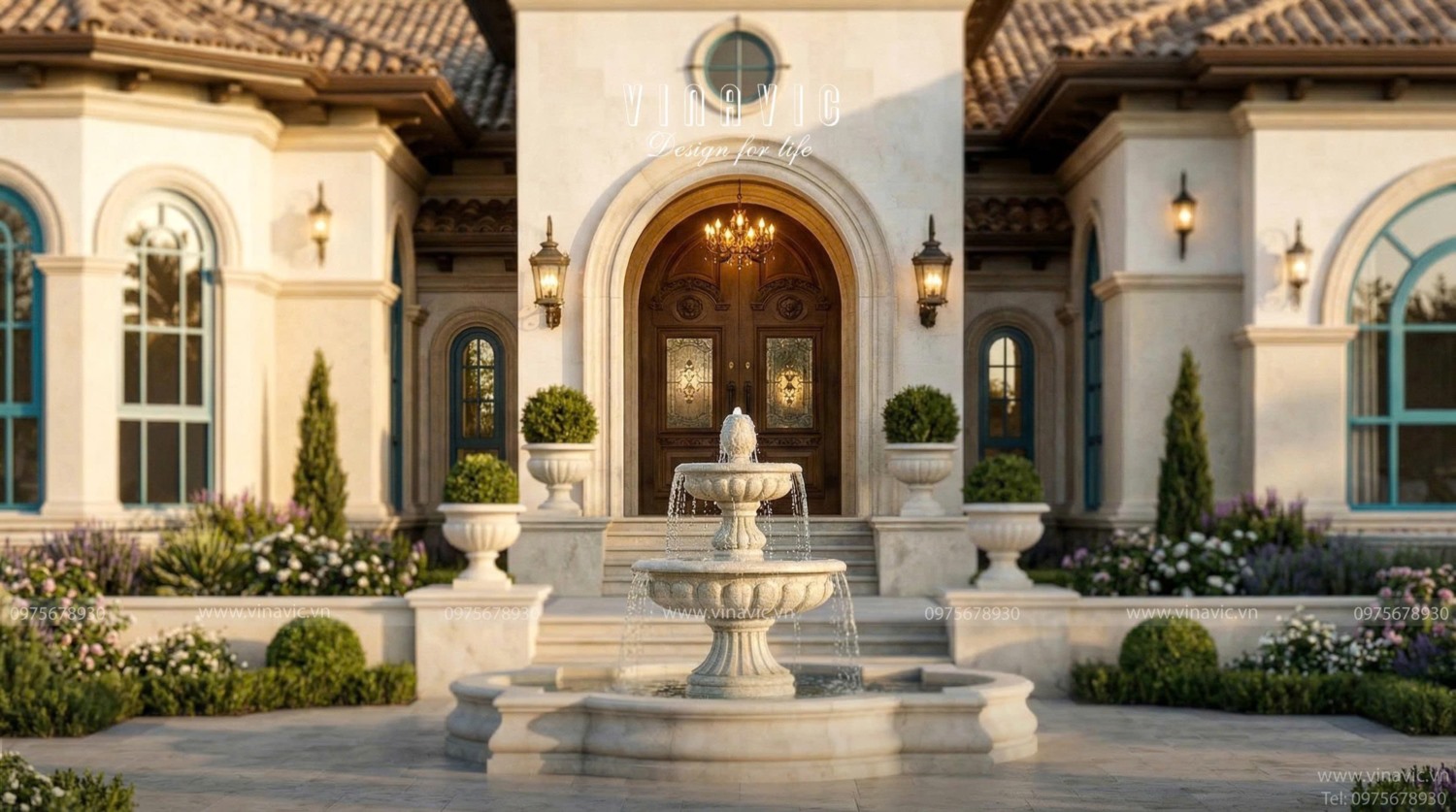 Không gian sân vườn được quy hoạch bài bản theo phong cách biệt thự nghỉ dưỡng, đóng vai trò kết nối toàn bộ kiến trúc với thiên nhiên xung quanh. Khu vực đài phun nước được bố trí tại trục chính tạo điểm nhấn trung tâm, kết hợp cùng lối dạo, sân ăn sáng và các khoảng sân xen kẽ giúp tăng trải nghiệm sử dụng. Hệ cây xanh được phân lớp hợp lý, vừa tạo bóng mát, vừa đảm bảo thông thoáng cho toàn bộ công trình. Tổng thể cảnh quan không chỉ nâng cao giá trị thẩm mỹ mà còn góp phần điều hòa vi khí hậu, mang lại môi trường sống trong lành và thư giãn.