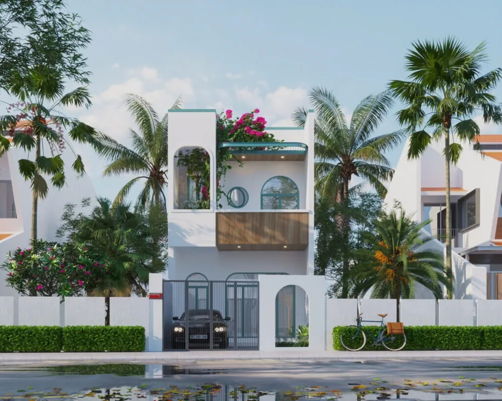 Mẫu nhà 1 trệt 1 lầu mái bằng phong cách xanh