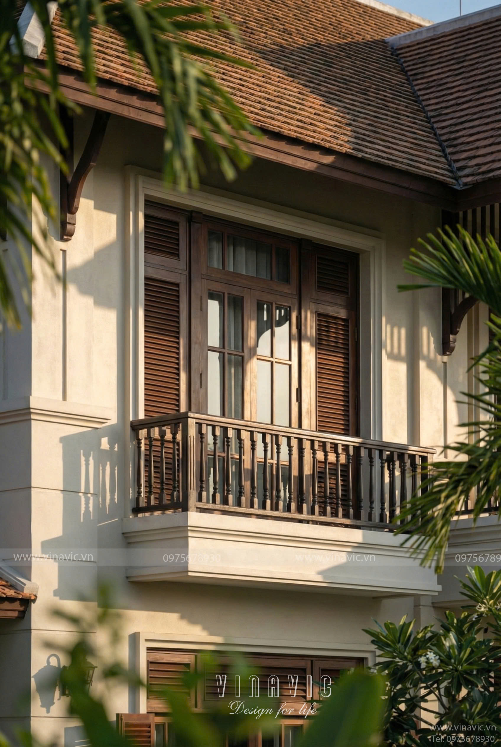 Mặt tiền công trình lược bỏ các phù điêu rườm rà, thay vào đó là sự lên ngôi của các chi tiết kiến trúc gỗ. Hệ thống cửa đi và cửa sổ sử dụng cửa chớp lá sách. Giải pháp này giúp điều tiết vi khí hậu: chắn nắng, cản mưa nhưng vẫn đảm bảo đối lưu không khí ngay cả khi đóng cửa, khắc phục nhược điểm nồm ẩm của khí hậu miền Bắc.