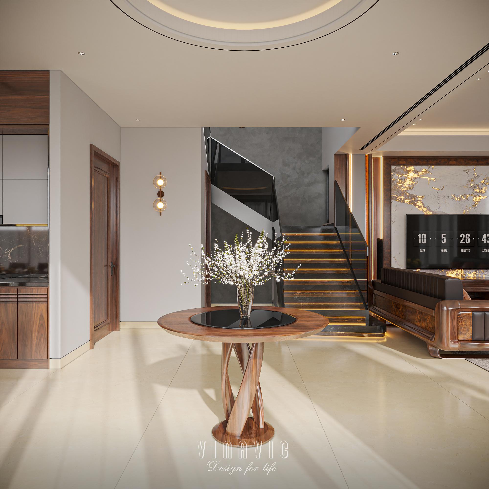 Bên cạnh đó, không gian được bố trí thoáng, nhiều ánh sáng tự nhiên, kết hợp hài hòa giữa gam màu ấm và các điểm nhấn vật liệu như gỗ, đá và kim loại trang trí. Thiết kế hướng đến một không gian sống hiện đại, sang trọng và phù hợp với phong cách sống của gia chủ.