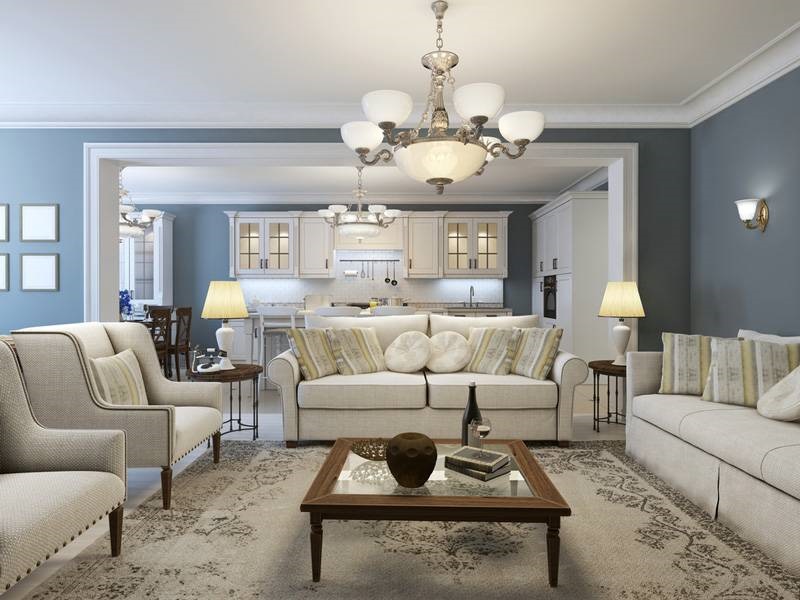 Điểm nhấn trong phòng khách có thể nằm ở đèn trần hoặc trang trí tường, rèm cửa, giấy dán tường...
