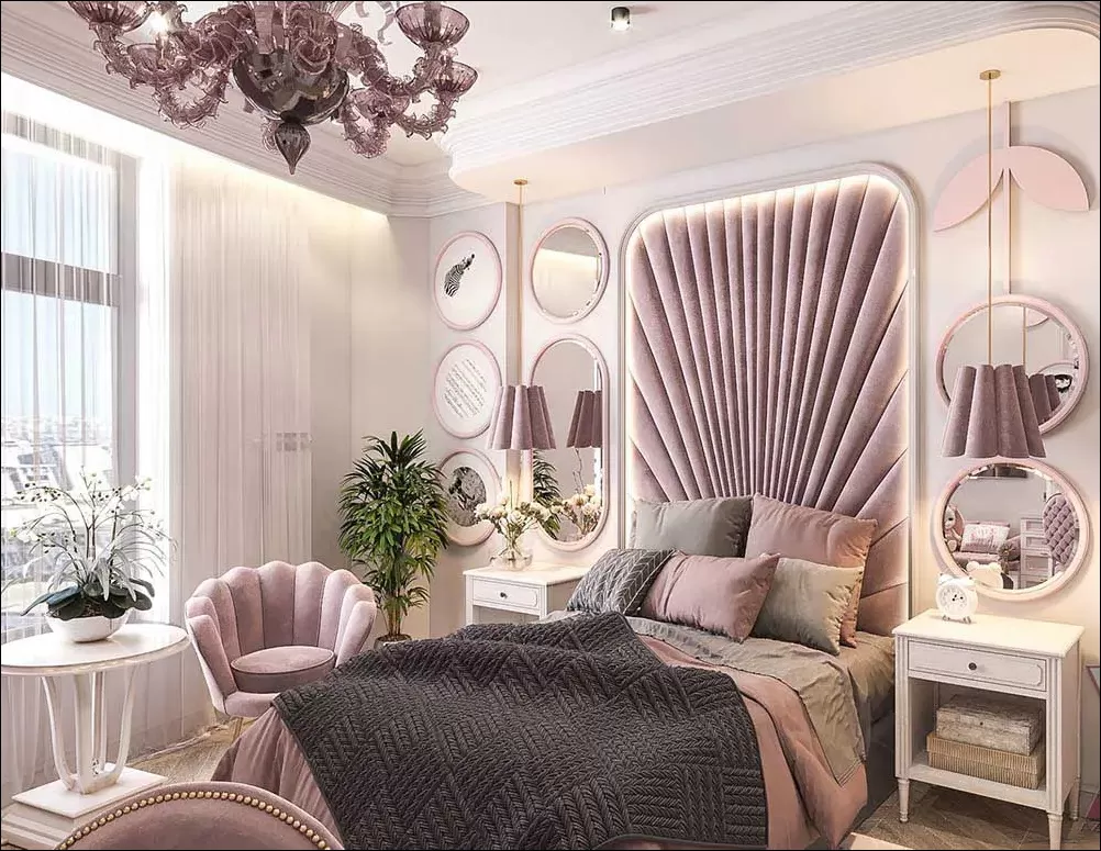 Thiết kế đối xứng: Sự kết hợp hài hòa đến từ những vị trí sắp xếp như chiếc gương, ghế, bàn trang điểm,.....được lựa chọn hoàn hảo, đồng bộ và hợp lý quanh khu vực giường ngủ.