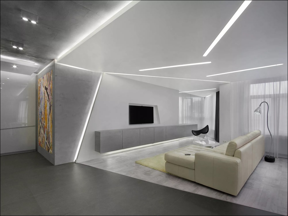 Ngoài ánh sáng tự nhiên phong cách Hitech chú trọng vào ánh sáng nhân tạo, đèn âm trần có dáng hình học.