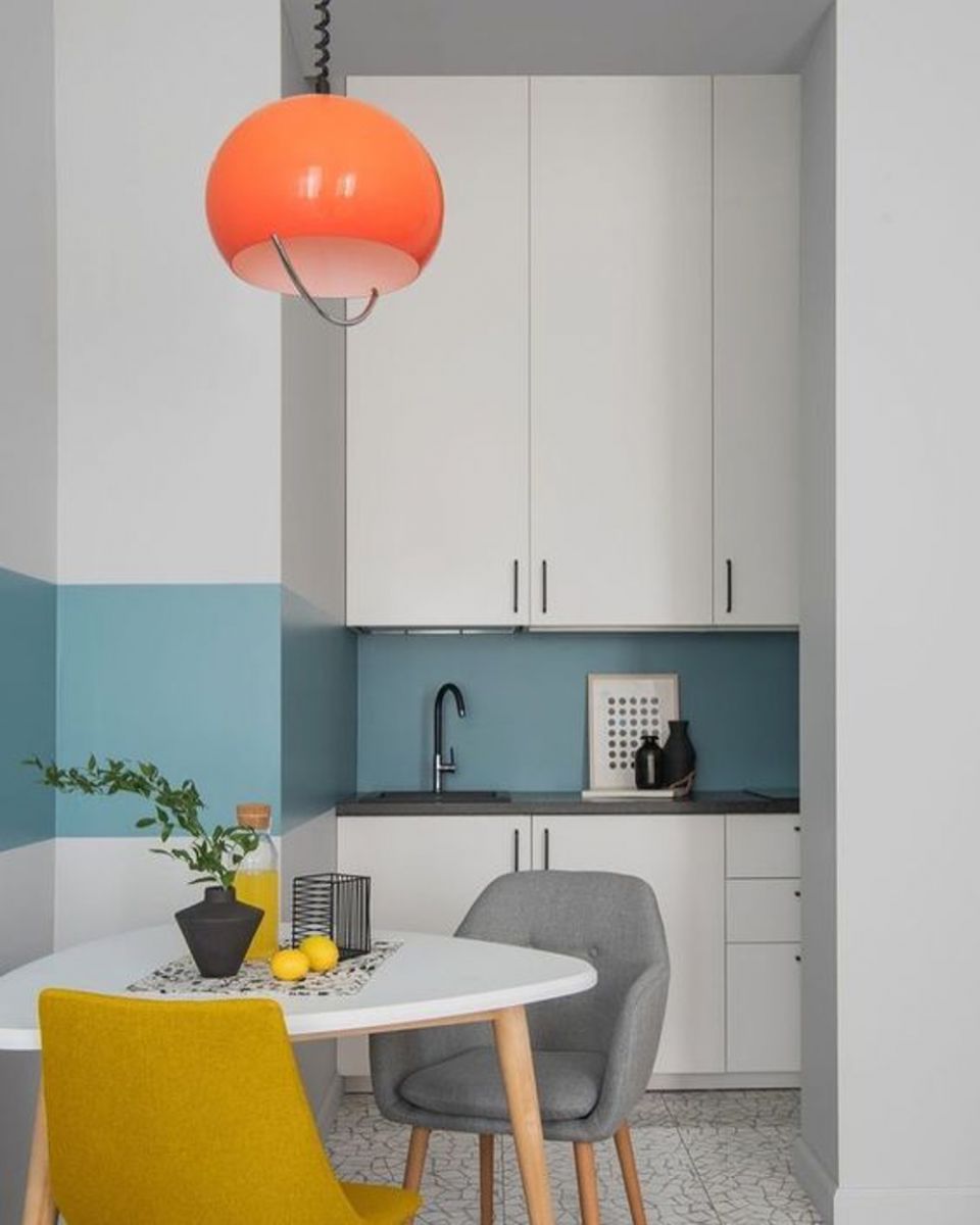 Phòng ăn thì nên khuyến khích dùng những gam màu nóng và tương phản cao để kích thích cảm giác thèm ăn và ngon miệng. Phụ kiện đi kèm là những chiếc đèn thả màu đỏ hoặc cam rực rỡ.
