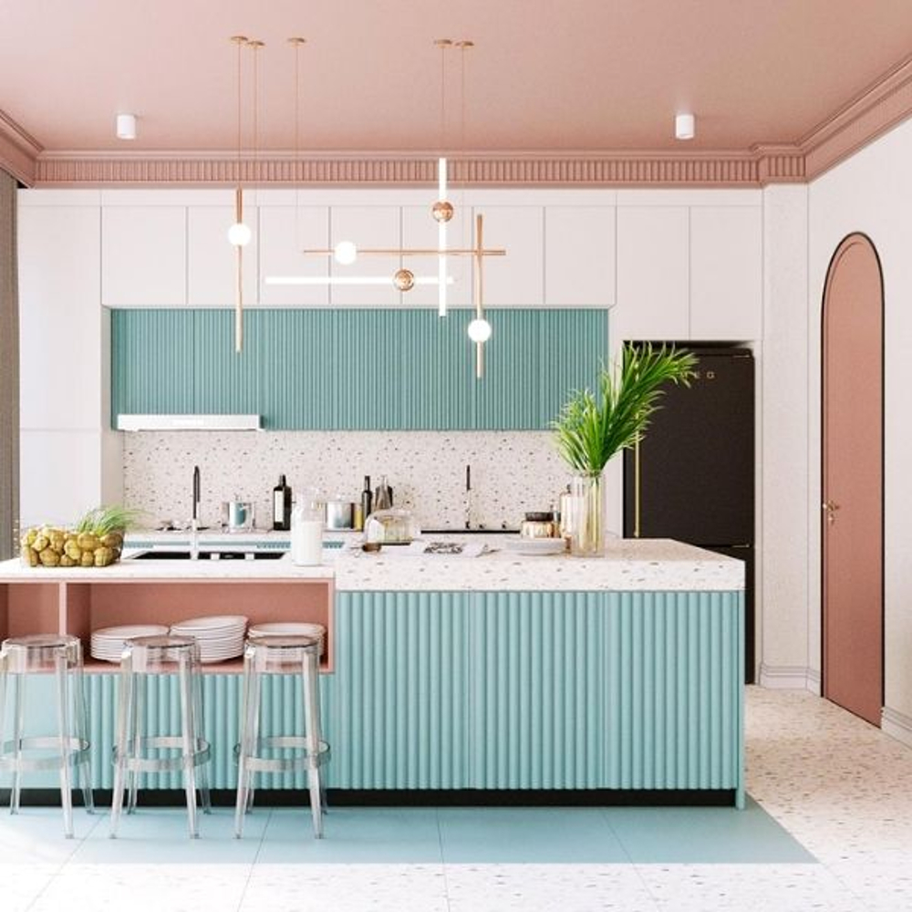 Phòng bếp hiện nay thường được thiết kế liên thông với không gian phòng khách. Và theo phong cách thiết kế color block khi thiết kế bếp nên tránh những màu quá tối hoặc quá nóng vì tạo cảm giác bức bí ngột ngạt. Nội thất không cần quá cầu kỳ, mà cần thoáng đãng hiện đại.