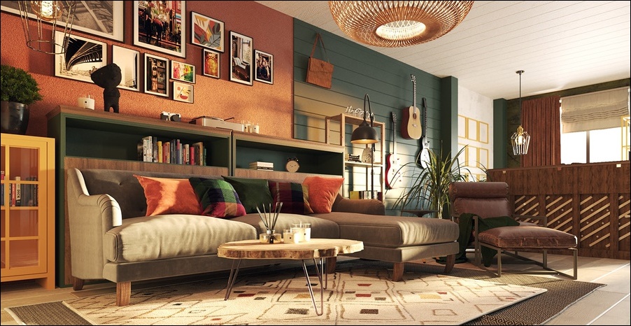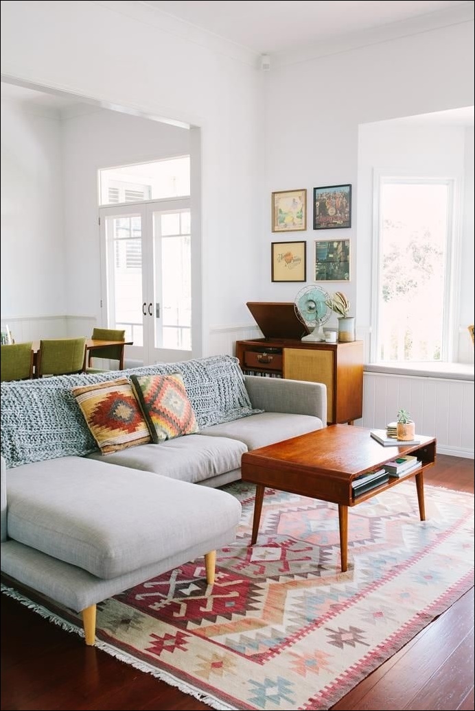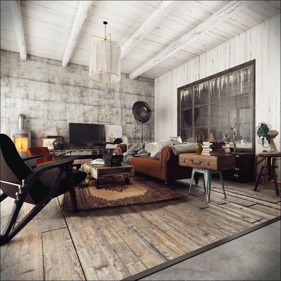 Những đồ trang trí như tranh treo tường, đồng hồ, gối tựa kết hợp cùng thảm trải sàn, sàn gỗ....là những món đồ được chọn trong không gian của phong cách vintage.