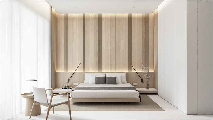Những căn phòng ngủ tối giản với phong cách minimalist thường được lựa chọn những gam màu trắng, be, kem để tạo không gian mở rộng.