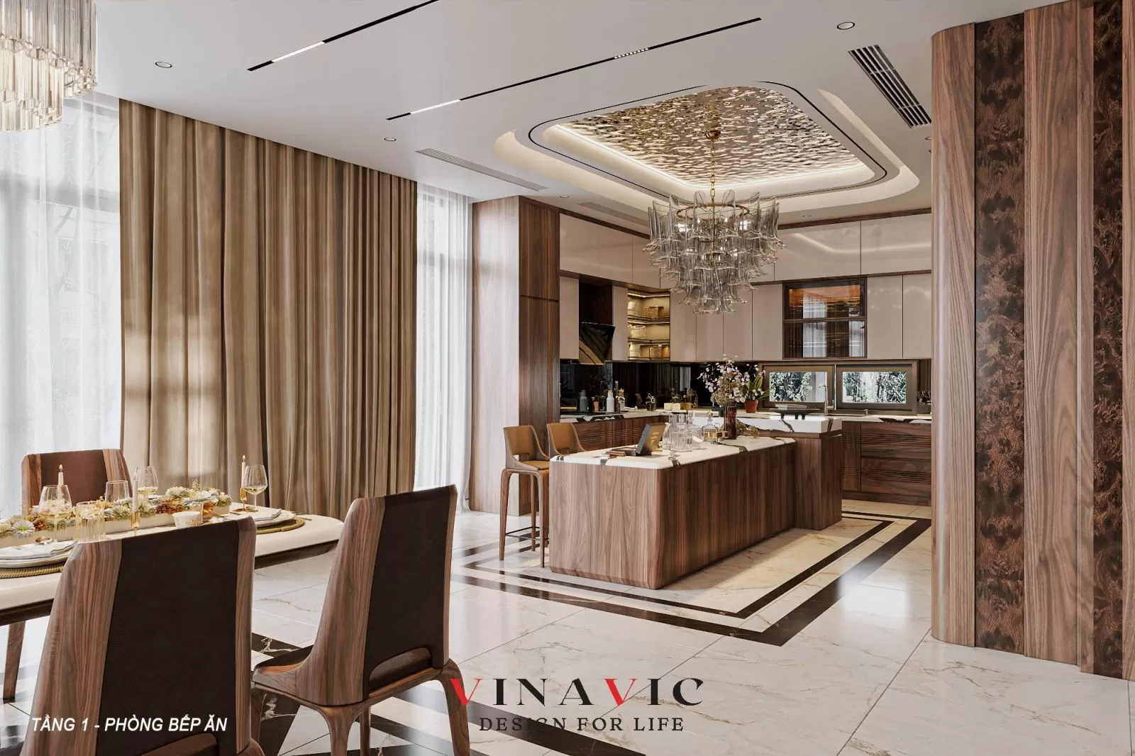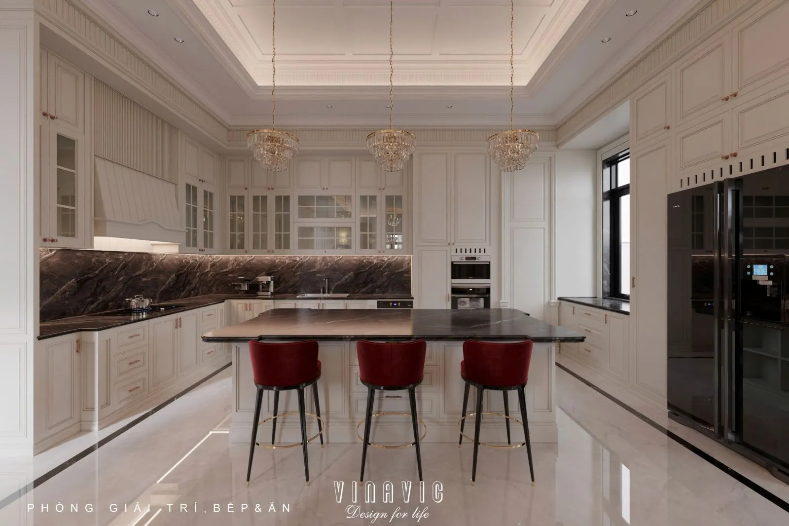 Thiết kế nội thất phòng khách tân cổ điển liên thông bếp NT2337
