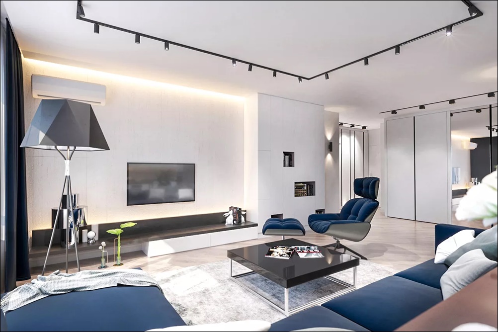 Phòng khách: Sofa, kệ TV loa đài, hệ thống đèn chiếu sáng