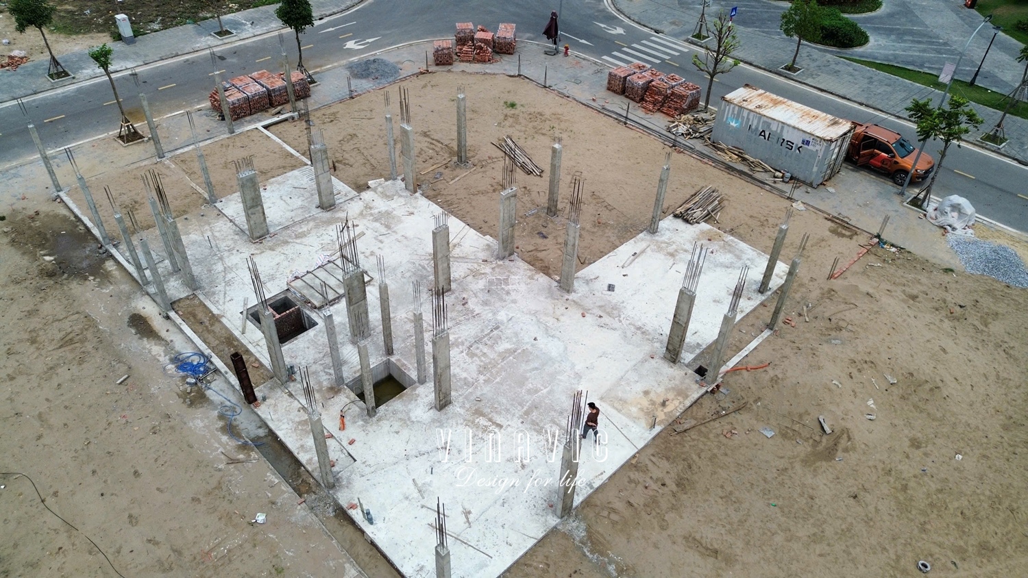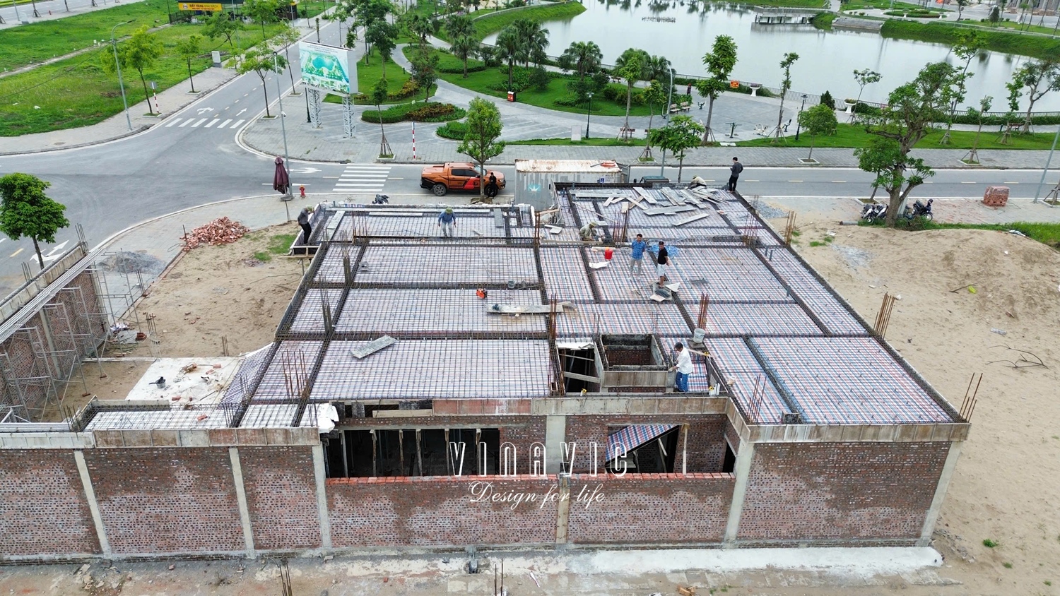 Hình ảnh chụp từ trên cao tại hiện trường xây dựng, cho thấy tiến độ thi công đang được triển khai đồng bộ và chuyên nghiệp bởi đội ngũ Vinavic
