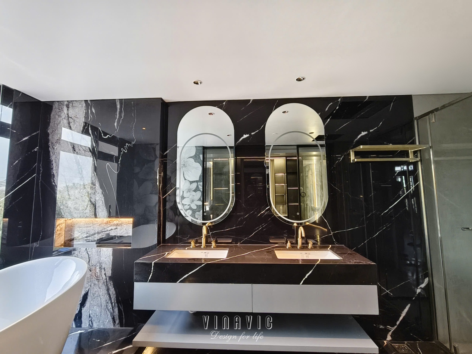 Lavabo đôi: Tiện nghi cho sinh hoạt vợ chồng, kết hợp gương đèn LED cảm ứng hiện đại.