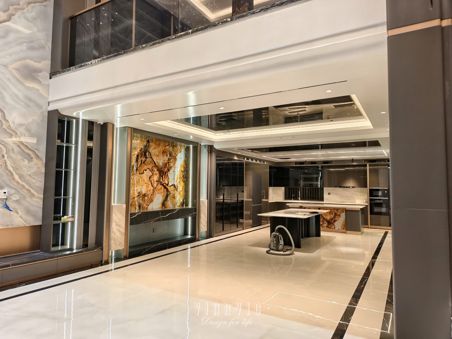 Điểm nhấn của biệt thự TCNT2257 chính là khu vực sảnh thông tầng. Vinavic đã khéo léo sử dụng hệ thống đèn chùm thả trần kích thước lớn với thiết kế mô phỏng đàn cá/lá vàng uốn lượn nghệ thuật. Ánh sáng vàng ấm phản chiếu lên các vách đá Marble tự nhiên khổ lớn chạy dọc từ sàn lên trần, tạo nên hiệu ứng thị giác choáng ngợp và lộng lẫy.