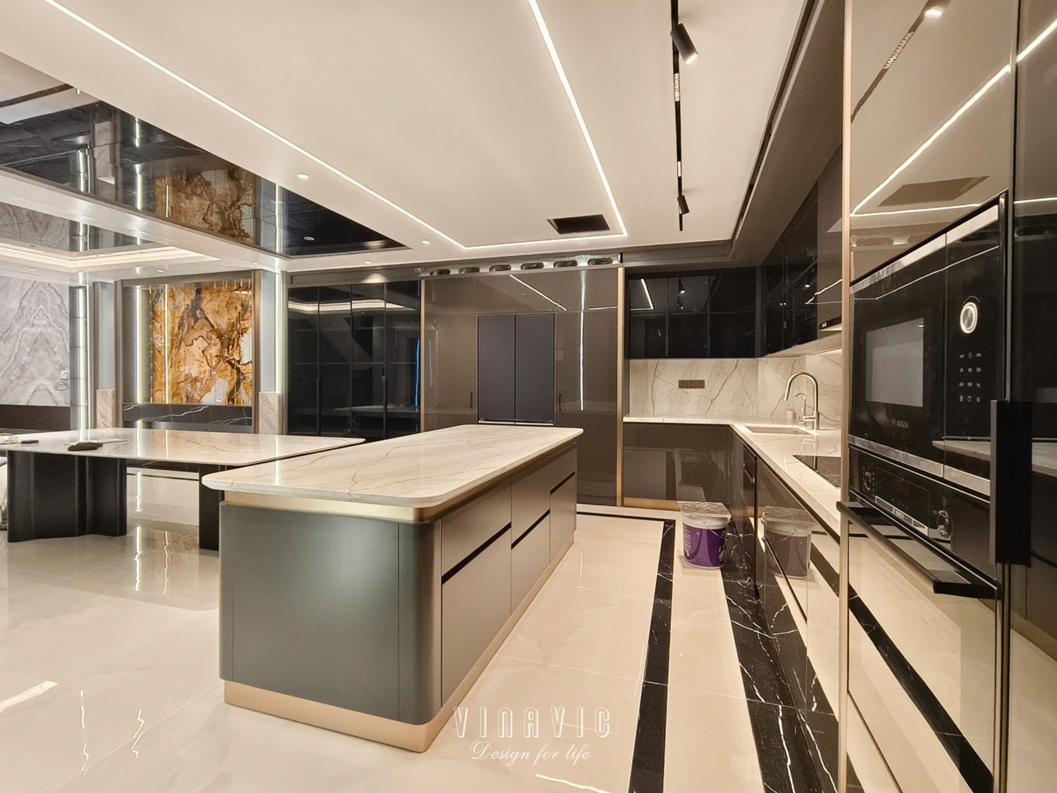 Khu vực bếp được thiết kế với hệ tủ bếp kịch trần phủ Acrylic bóng gương màu ghi xám sang trọng. Với hê bàn đảo bếp kết hợp đá xuyên sáng Onyx màu hổ phách. Chi tiết này không chỉ là nơi chế biến món ăn mà còn đóng vai trò như một khối trang trí nghệ thuật, phát sáng rực rỡ và ấm áp giữa không gian hiện đại.
