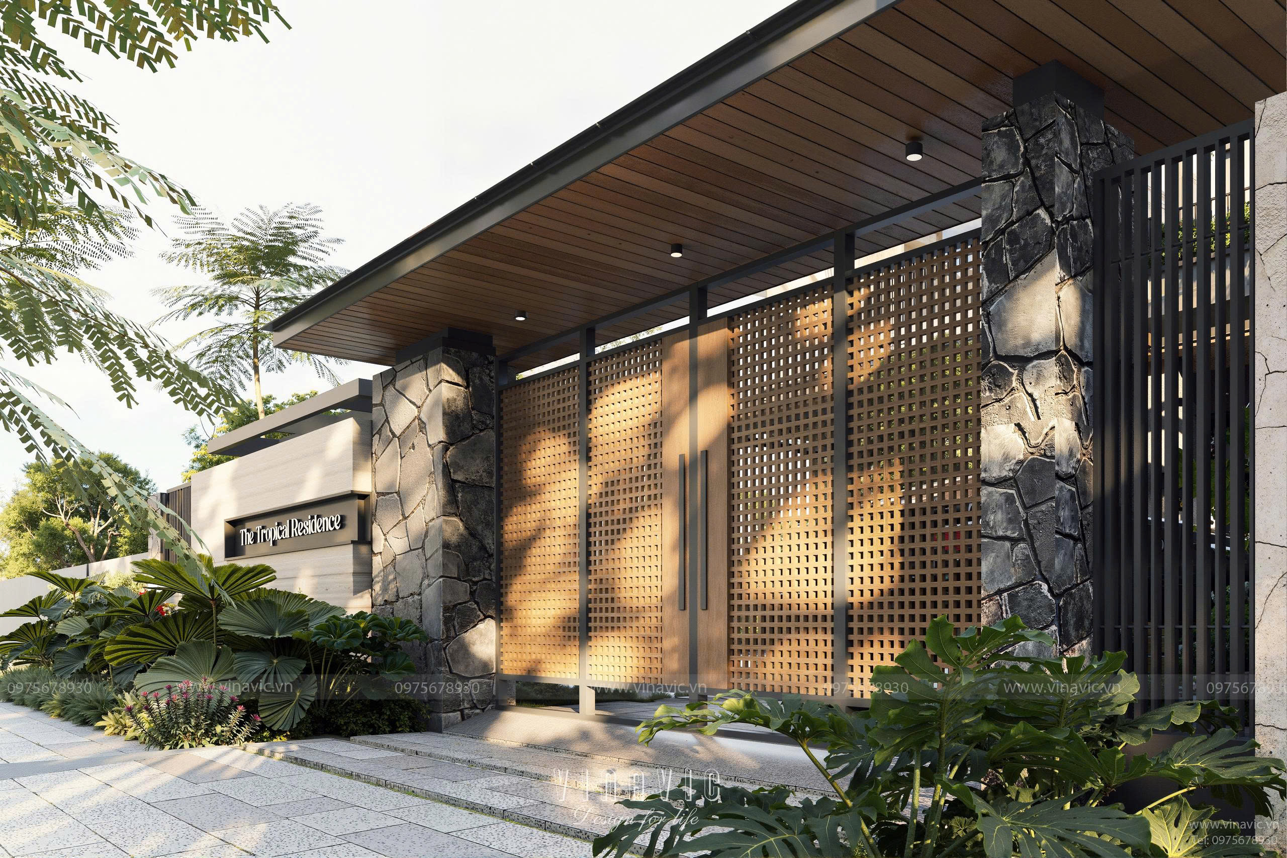 Cổng vào "The Tropical Residence": Ngay từ cổng vào, ta đã cảm nhận được tinh thần "resort". Một hệ cổng bề thế với trụ ốp đá, mái che lợp ngói Nhật và cánh cổng bằng gỗ nan thưa tạo nên một ấn tượng sâu sắc, vừa riêng tư, vừa chào đón.