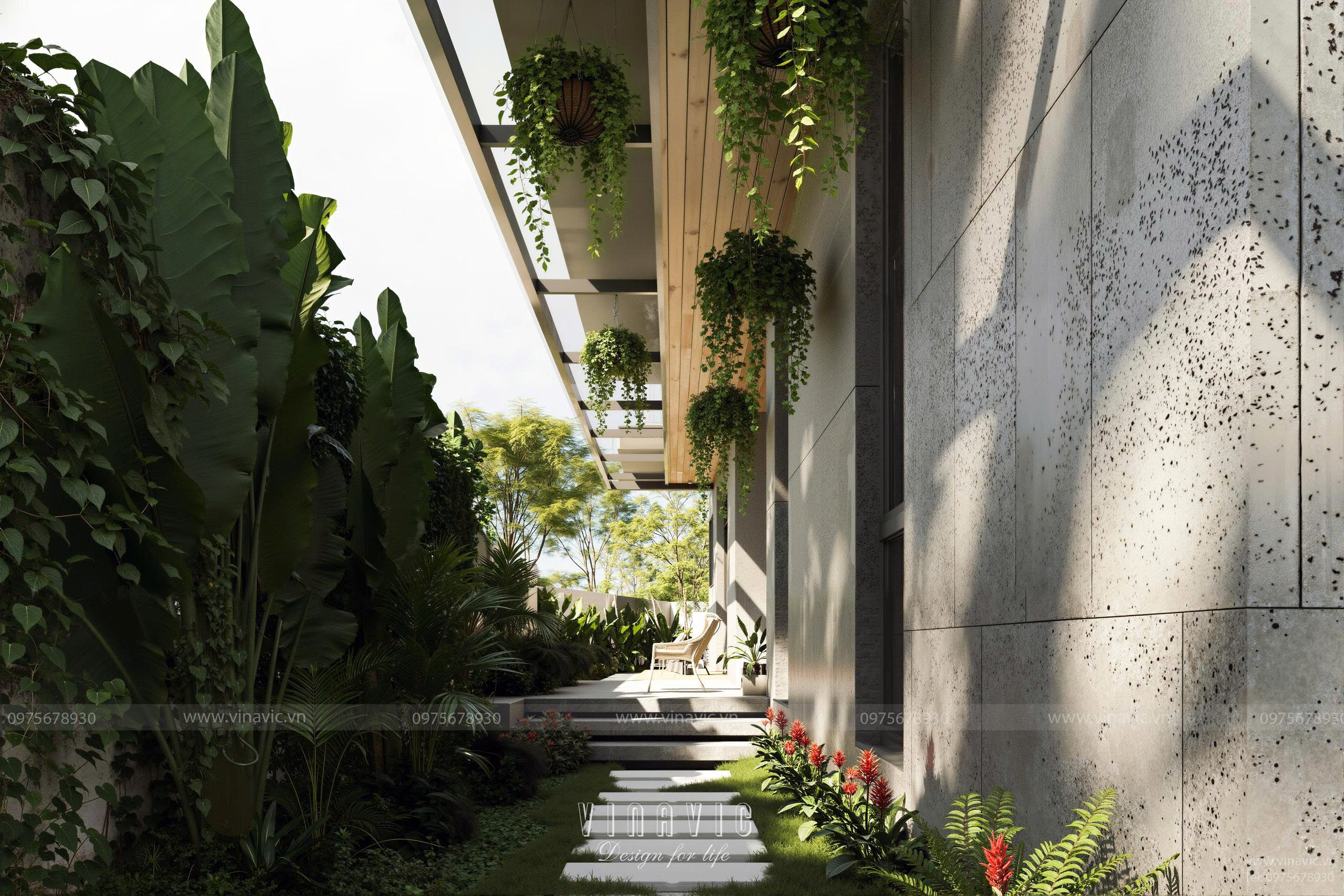 Lối đi dạo ven nhà: Một con đường nhỏ lát đá, cỏ mọc xen kẽ, uốn lượn bên hông nhà. Dọc theo lối đi là các bồn cây nhiệt đới (trầu bà Nam Mỹ, chuối cảnh, cọ...). Phía trên hiên nhà, các giỏ cây rủ xuống tạo nên một bức rèm thiên nhiên lãng mạn.