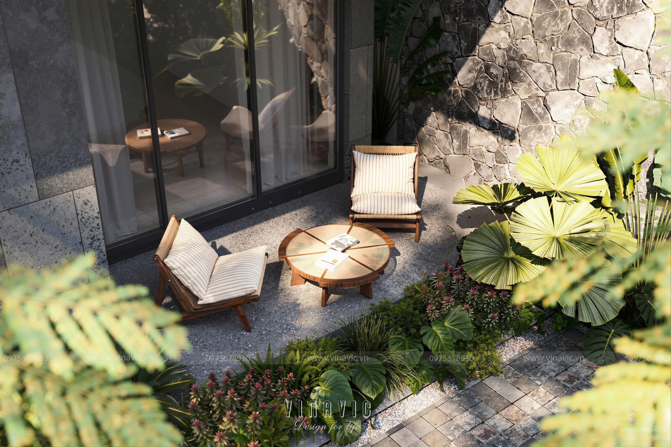 Các "góc chill" nhỏ: Bên ngoài phòng ngủ, phòng khách là những hiên nhà nhỏ kê thêm bộ bàn ghế mộc mạc. Chỉ cần bước ra khỏi cửa là bạn đã có thể hòa mình vào thiên nhiên, nhâm nhi một tách cà phê và lắng nghe tiếng chim hót.