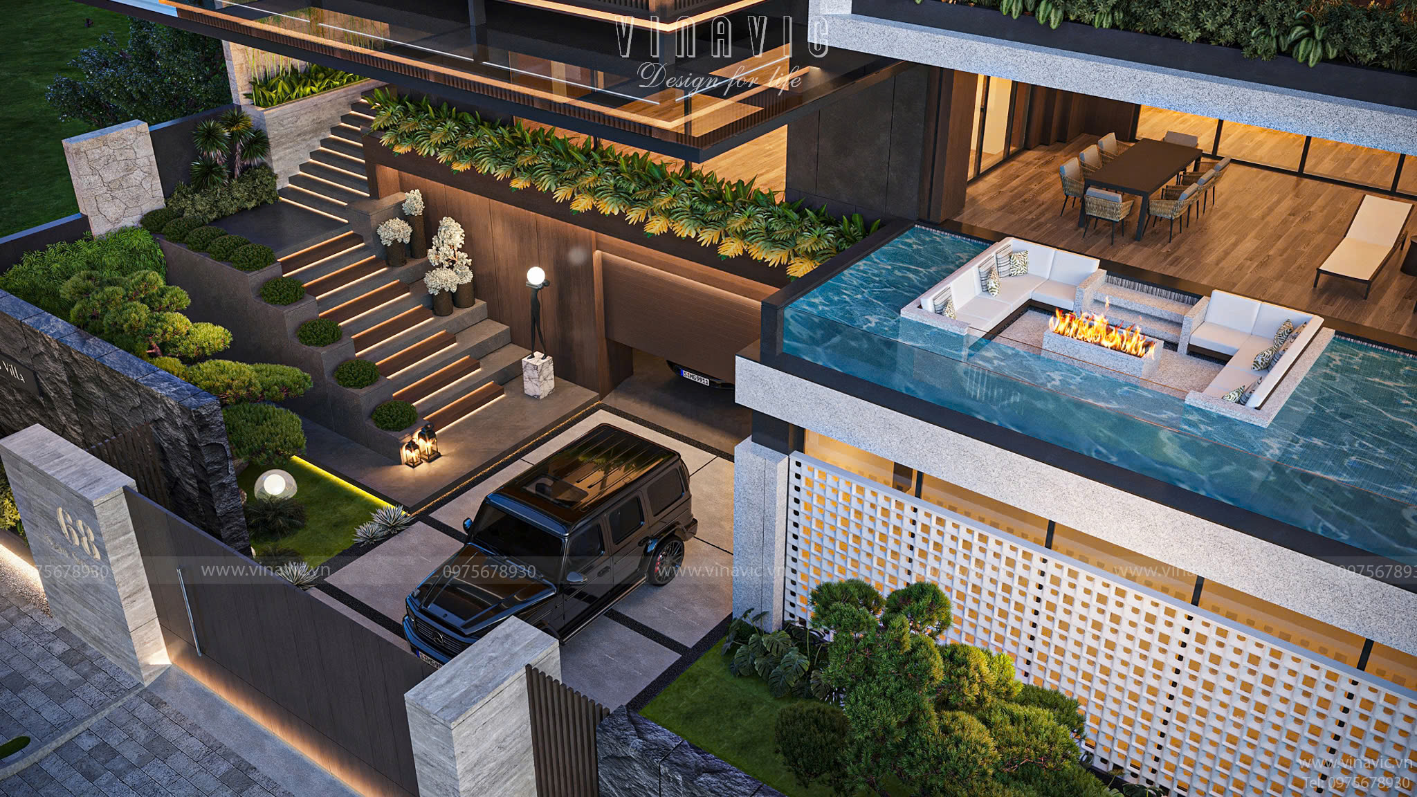 Tầng 2: Là trái tim thẩm mỹ của căn biệt thự, nơi hội tụ không gian tiếp khách cao cấp, hồ bơi thư giãn, phòng trà – cigar và tiểu cảnh xanh. Mỗi khu vực đều mang dấu ấn hưởng thụ và cá tính riêng biệt, đúng chất sống thượng lưu.