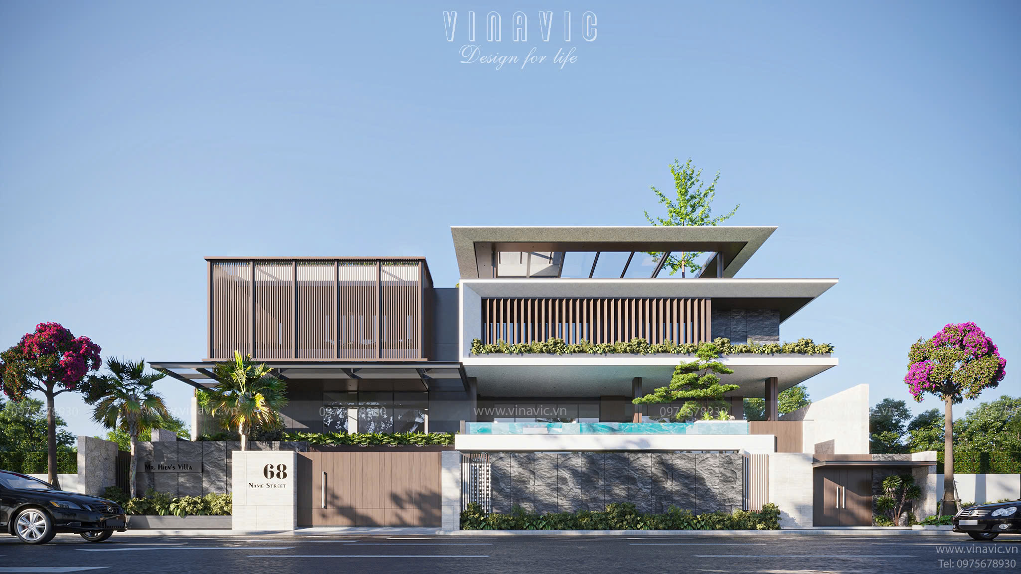 Tỷ lệ kiến trúc hoàn mỹ cân bằng giữa công năng & thẩm mỹ: Nhấn mạnh bố cục khối nhà, tỷ lệ các tầng, chiều cao hợp lý, tạo nên cảm giác bề thế nhưng không nặng nề. Sự tinh tế đến từng đường nét. Các mảng tường lớn, hệ mái bằng và đường nét ngang dứt khoát thể hiện tư duy thiết kế đương đại, phá vỡ khuôn mẫu biệt thự truyền thống. Ánh sáng tự nhiên được tận dụng tối đa qua hệ cửa kính lớn, mang lại cảm giác thoáng đãng, mở rộng tầm nhìn và kết nối hài hòa với thiên nhiên.