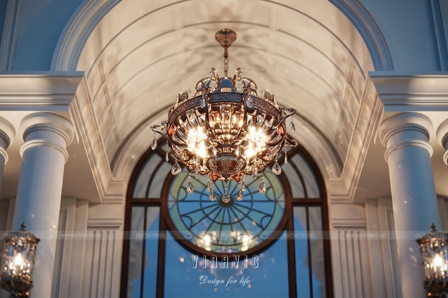 Thay vì đắp vẽ hoa văn phù điêu rườm rà, B' Villa ưu tiên những đường phào chỉ sắc nét, gờ tường tinh tế để tạo điểm nhấn. Đặc biệt, hệ thống đèn chùm pha lê cỡ lớn treo tại sảnh chính kết hợp với khung cửa kính hoa đồng vòm cong tạo nên hiệu ứng thị giác rực rỡ, quyền quý khi màn đêm buông xuống.