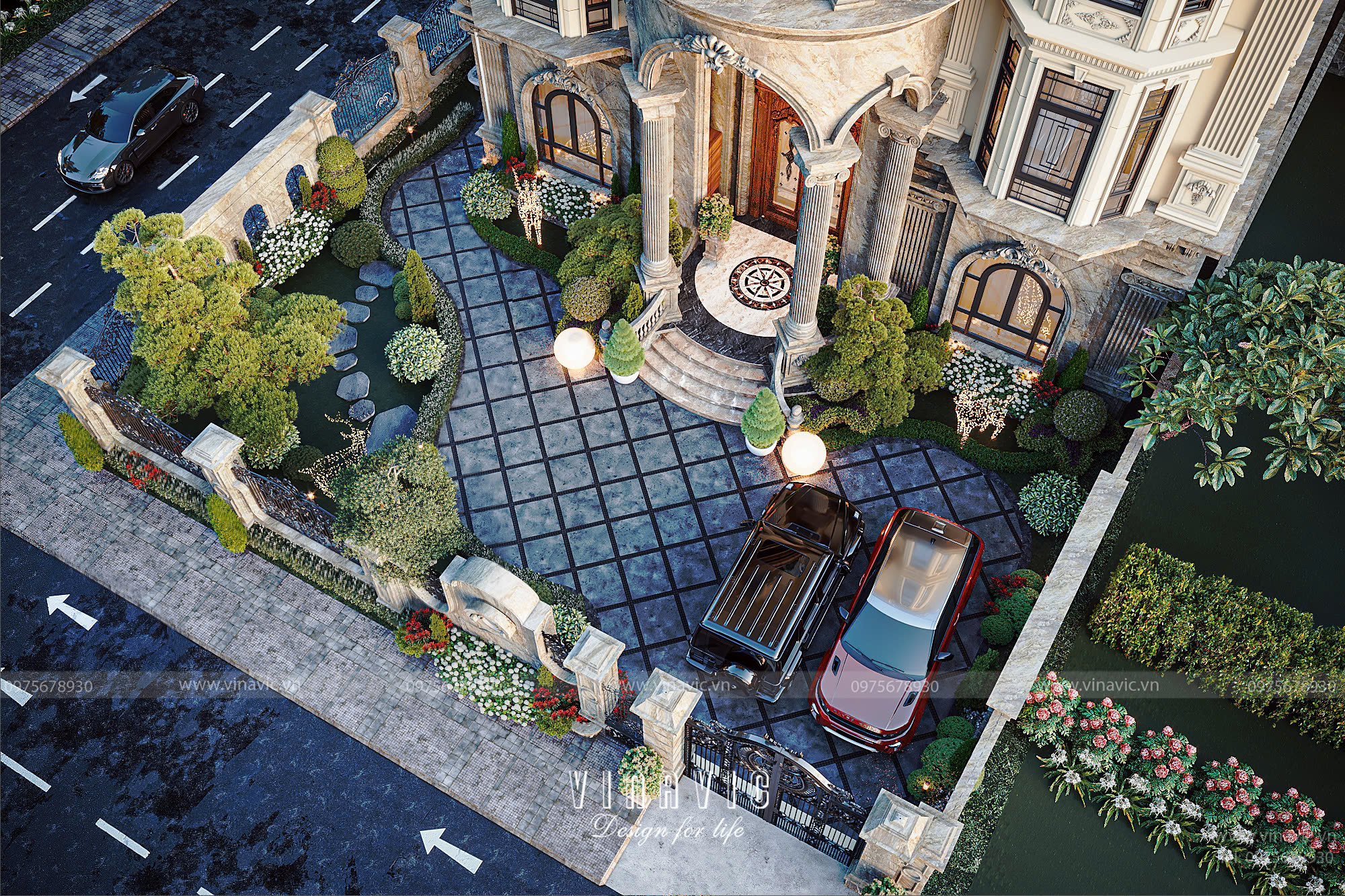 Cảnh quan sân vườn được quy hoạch đồng bộ với kiến trúc, sử dụng cây xanh, tiểu cảnh và lối dạo uốn lượn nhằm tạo không gian thư giãn chuẩn phong cách biệt thự châu Âu. Sự kết hợp giữa kiến trúc và thiên nhiên góp phần tôn vinh vẻ đẹp sang trọng và đẳng cấp của toàn bộ công trình.