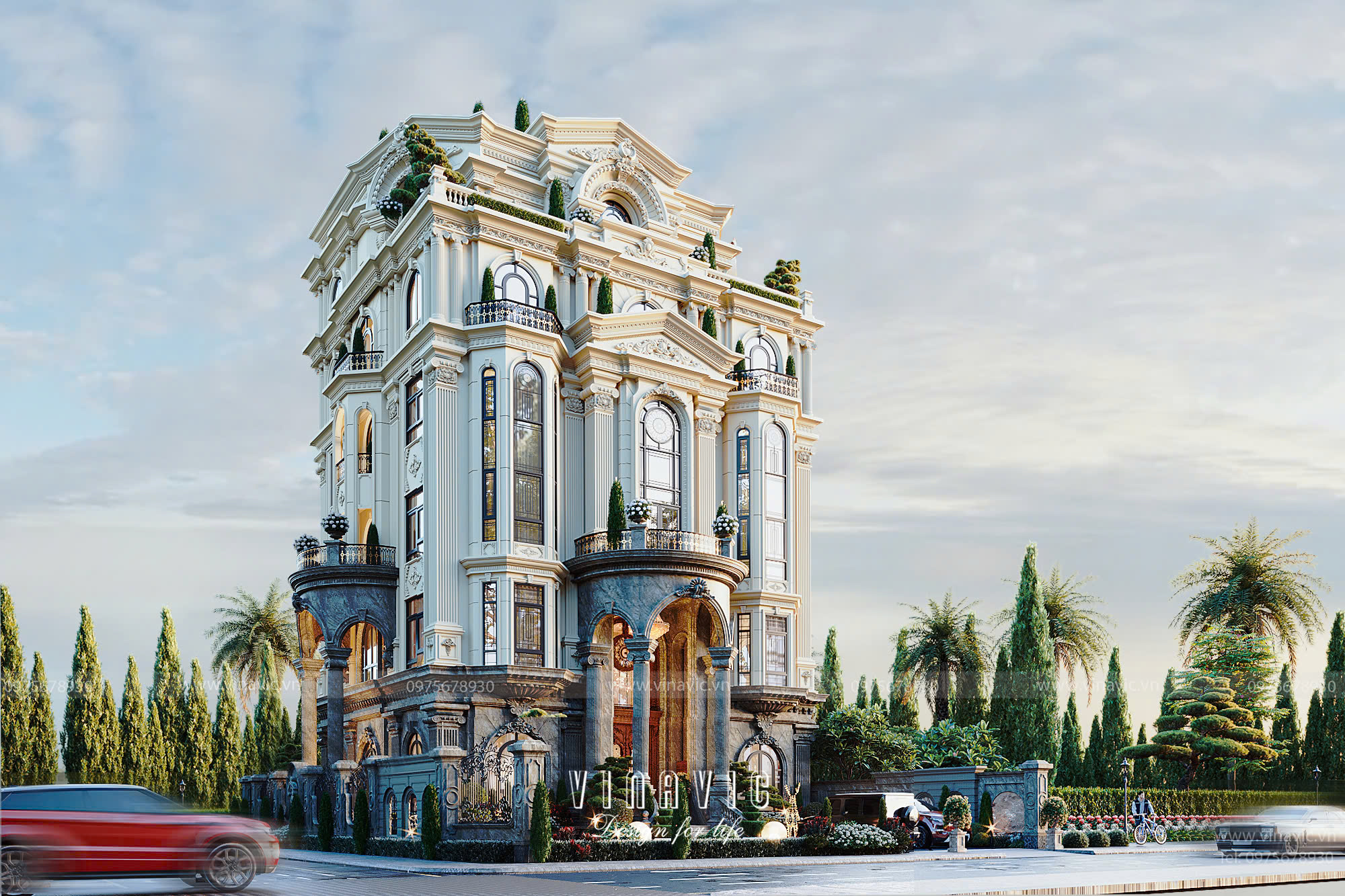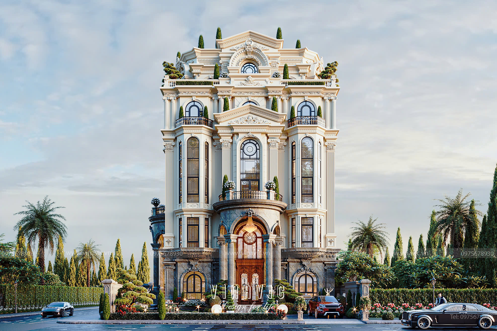 Biệt thự được tạo hình theo bố cục đối xứng đặc trưng của kiến trúc Tân Cổ Điển Châu Âu, với khối nhà cao tầng bề thế, rộng lớn, mạch lạc và cân xứng. Các khối đua, khối giật cấp được xử lý tinh tế, vừa tôn lên chiều cao công trình, vừa tạo nhịp điệu kiến trúc uyển chuyển, thể hiện rõ sự quyền quý và vững chãi.