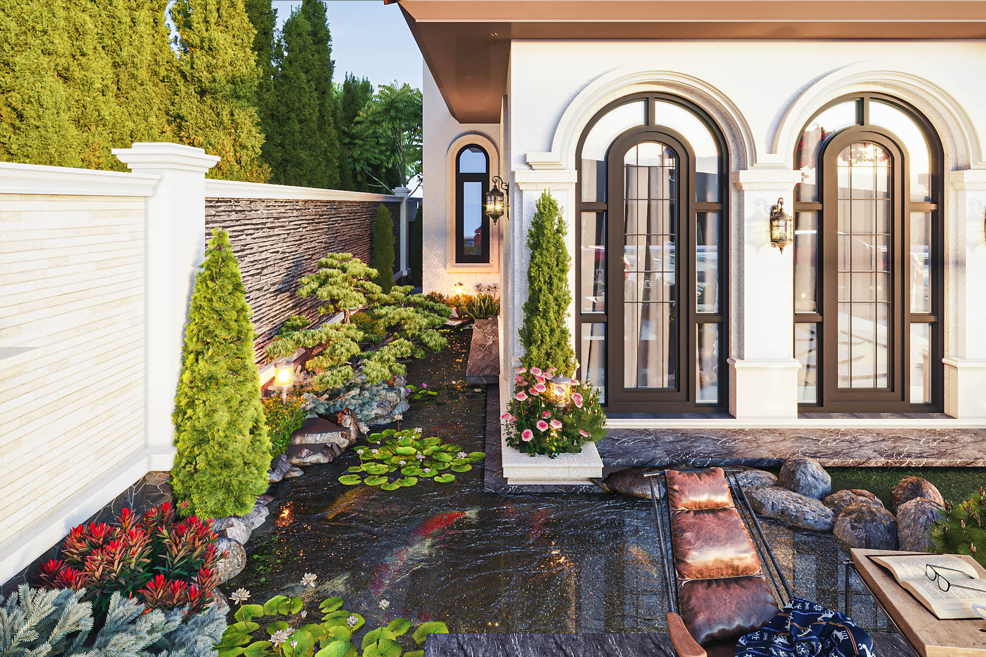 Cuối cùng, yếu tố phong thủy không thể thiếu: nước và cây được bố trí hợp lý để cân bằng âm dương, đường đi uốn lượn mềm mại để dòng khí lưu thông thuận lợi. Sự kết hợp của tất cả những nguyên tắc này tạo nên một sân vườn đẹp, hài hòa và bền vững cùng thời gian.