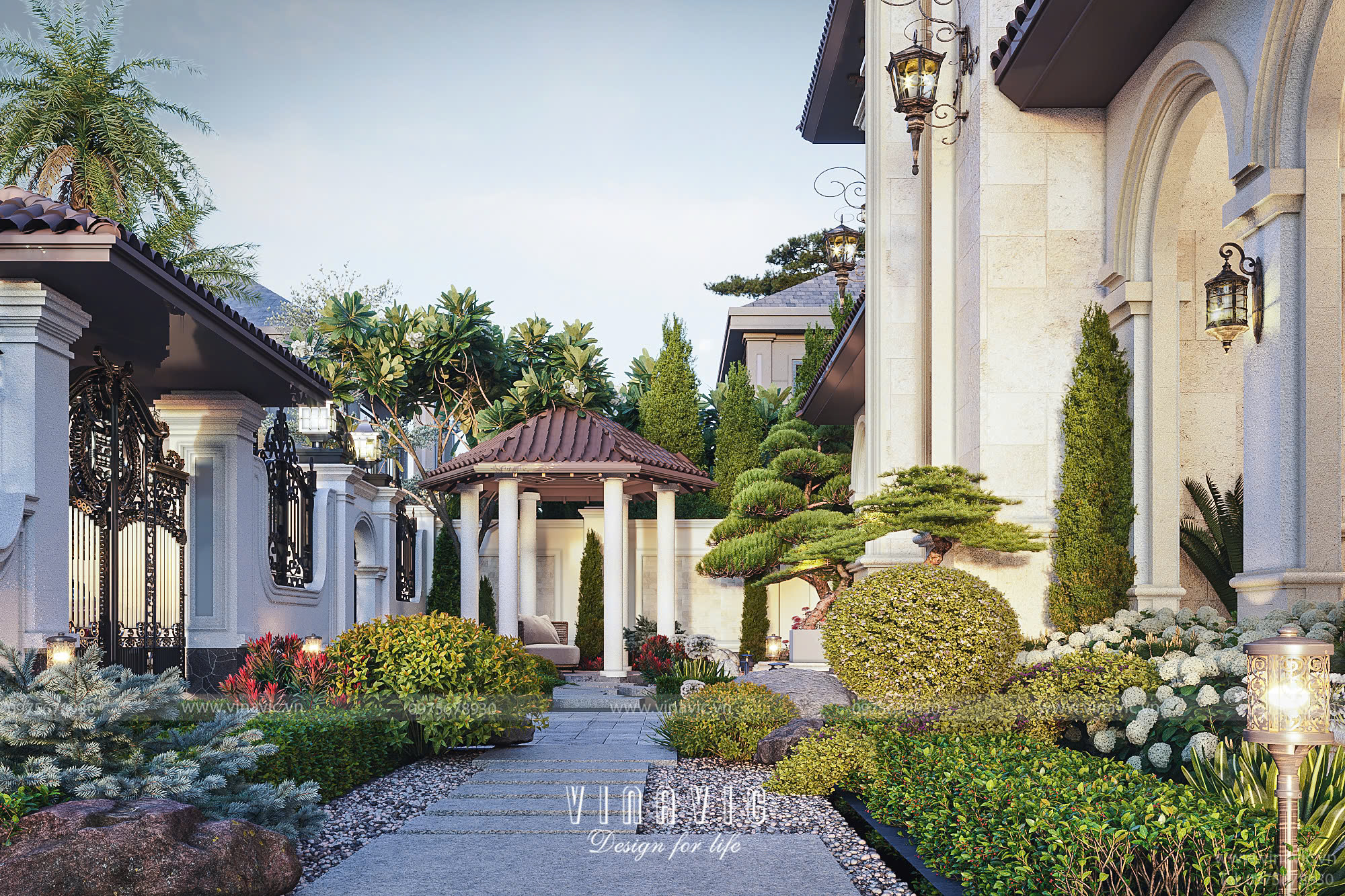 Thiết kế cảnh quan sân vườn TCSV2006 chú trọng sự cân bằng giữa thẩm mỹ, công năng và phong thủy, nhằm mang lại không gian sống vừa sang trọng vừa gần gũi thiên nhiên. Các nguyên tắc cơ bản được áp dụng một cách tỉ mỉ để đảm bảo sân vườn không chỉ đẹp mắt mà còn hài hòa với kiến trúc tổng thể của biệt thự.
