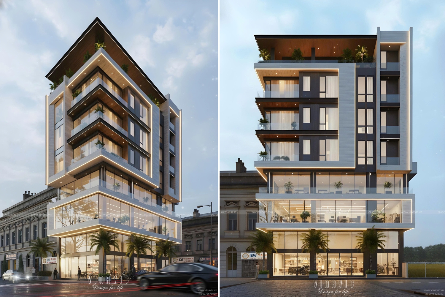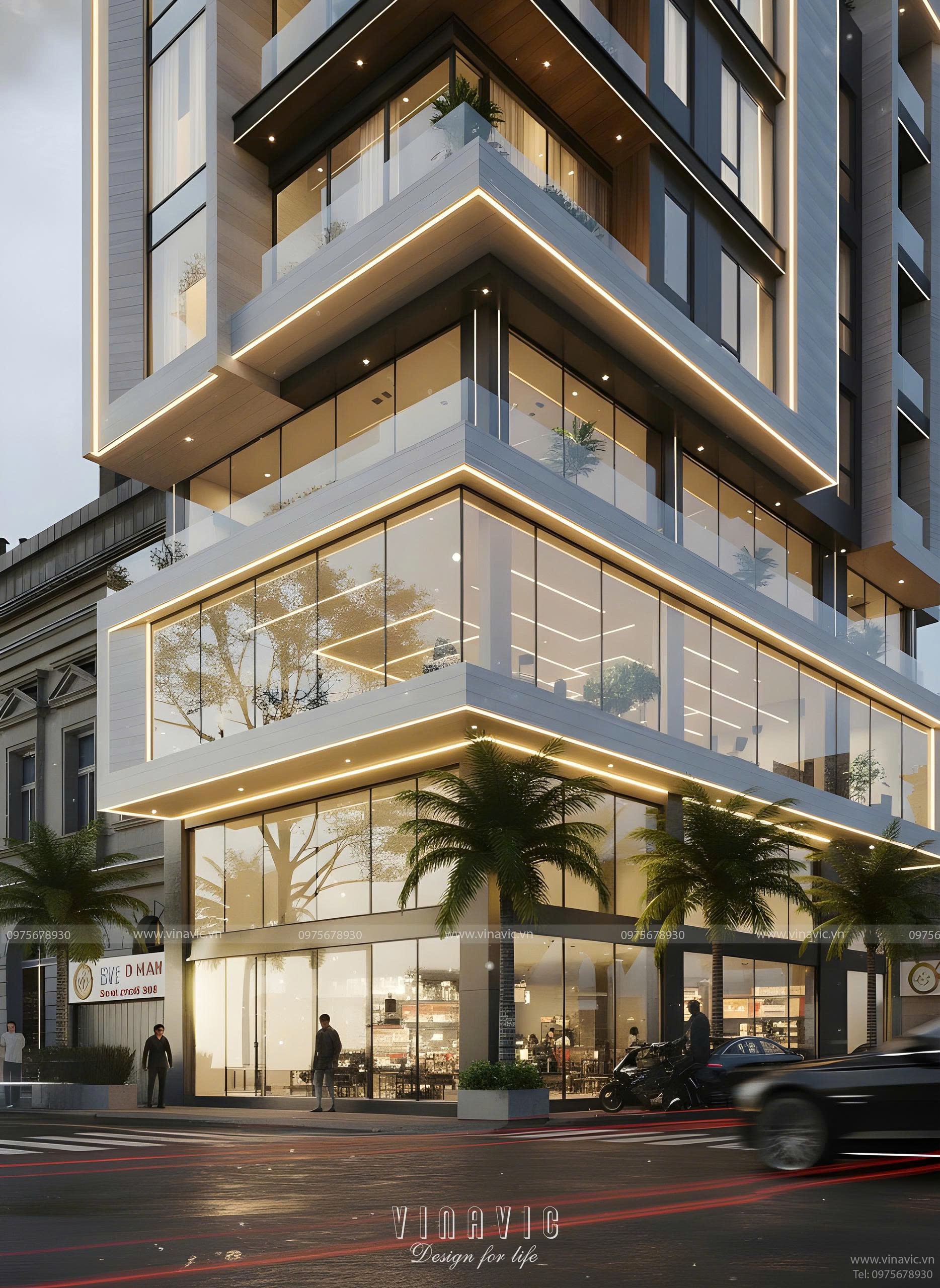 Tầng 1 - 3: Đây là khối thương mại, được thiết kế "mở" tối đa với hệ thống vách kính cường lực lớn từ sàn đến trần. Giải pháp này không chỉ phô diễn toàn bộ không gian kinh doanh sang trọng bên trong mà còn tạo cảm giác mời gọi, thu hút khách hàng và tối ưu ánh sáng tự nhiên.