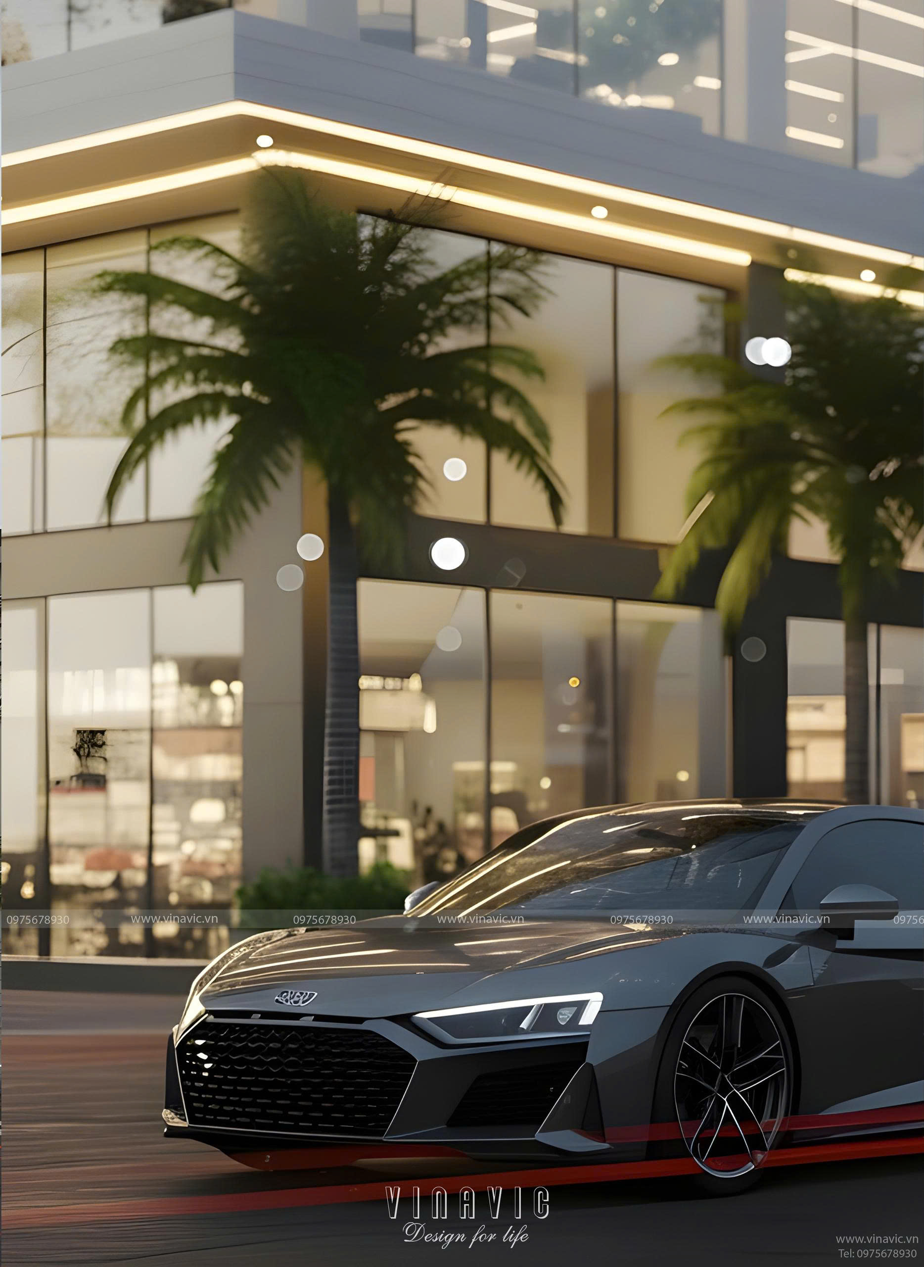 Vật liệu: Kính cường lực (cho khối đế và ban công), khung nhôm (sơn đen tĩnh điện), và vật liệu ốp mặt tiền cao cấp (như đá tự nhiên, gạch ốp, hoặc tấm ốp xi măng sợi) màu trắng xám.