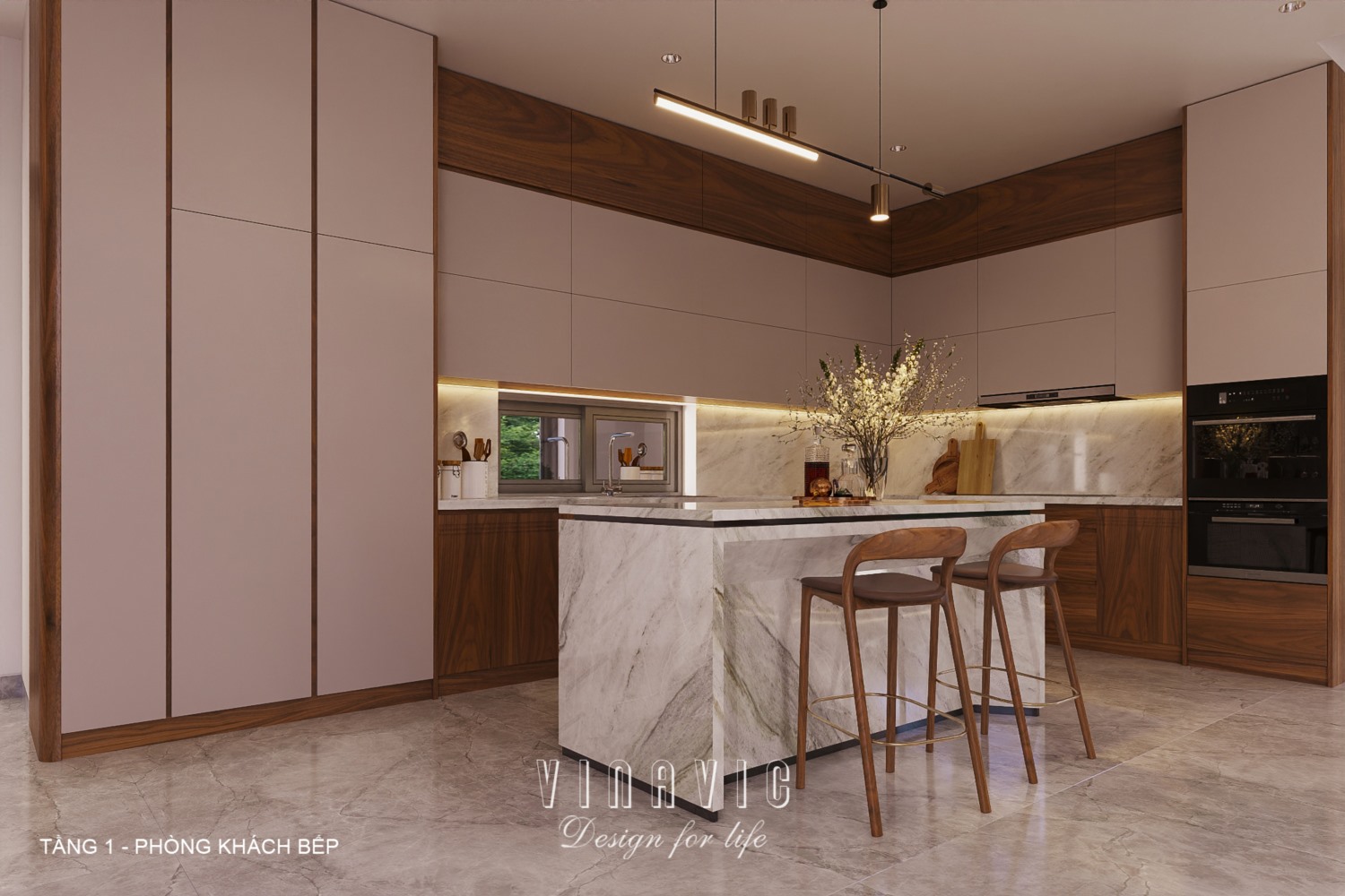Ngoài ra, nội thất cao cấp được thiết kế tối giản nhưng chú trọng công năng, không gian sống của các thành viên. Các món đồ như sofa, bàn trà, tủ trang trí hay hệ tủ bếp đều được thiết kế gọn gàng, tinh tế, đảm bảo sự tiện lợi trong sinh hoạt mà vẫn giữ được tính thẩm mỹ cao. Hệ thống đèn chiếu sáng cũng được bố trí linh hoạt với đèn chùm, đèn âm trần và đèn trang trí để tạo điểm nhấn cho từng khu vực.