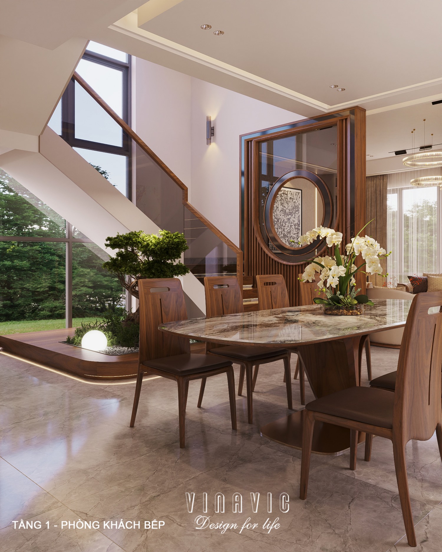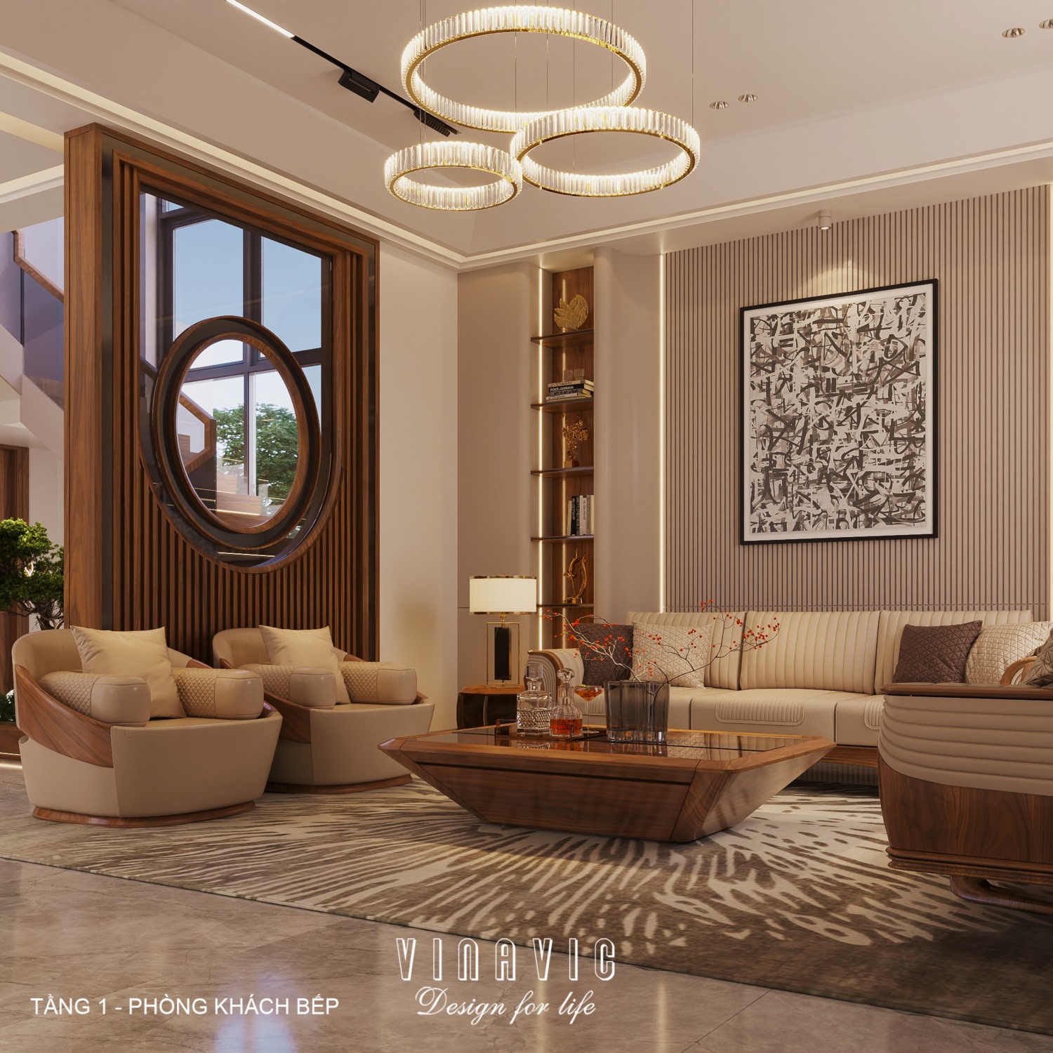 Ánh sáng đóng vai trò quan trọng trong thiết kế nội thất hiện đại. Ngoài ánh sáng tự nhiên từ cửa kính lớn, hệ thống đèn trang trí như đèn chùm, đèn âm trần hay đèn hắt tường được bố trí hợp lý để tạo điểm nhấn cho từng khu vực. Những chi tiết trang trí như tranh nghệ thuật, kệ decor hoặc cây xanh cũng góp phần mang lại cảm giác ấm cúng và sinh động cho không gian biệt thự.