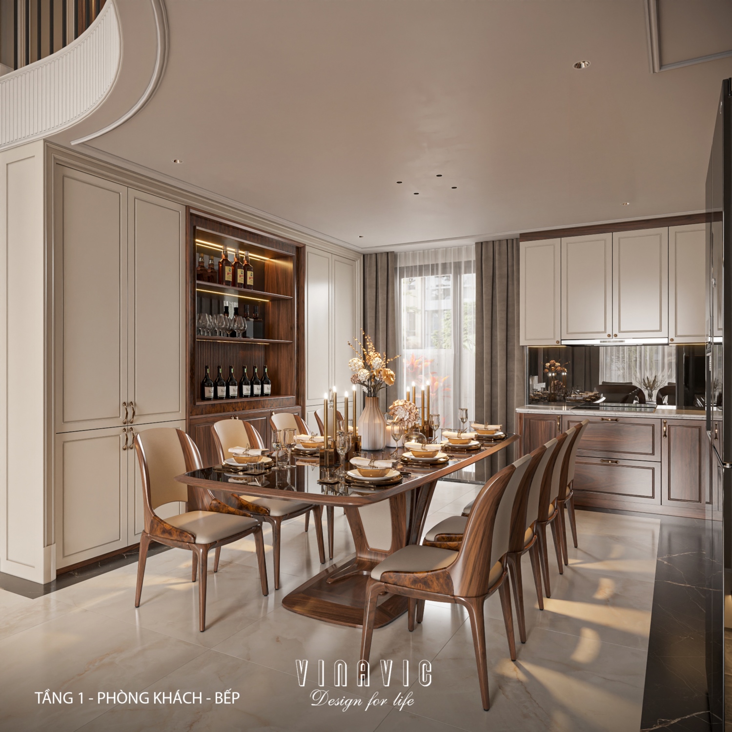 Bếp ăn: Nằm ở phía sau, thiết kế theo chữ L. Hệ tủ bếp là sự kết hợp giữa tủ dưới bằng gỗ óc chó và tủ trên màu trắng kem, giúp không gian bếp nhẹ nhàng, không bị "nặng". Kính ốp bếp màu đen sạch sẽ, tương phản mạnh mẽ. Toàn bộ thiết bị (tủ lạnh side-by-side, lò nướng, máy pha cà phê) đều được bố trí âm tủ gọn gàng.