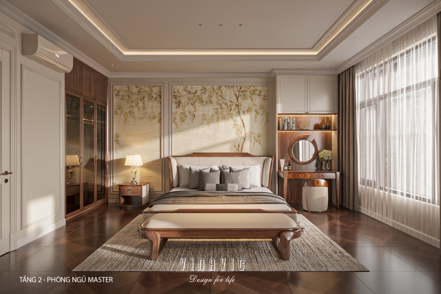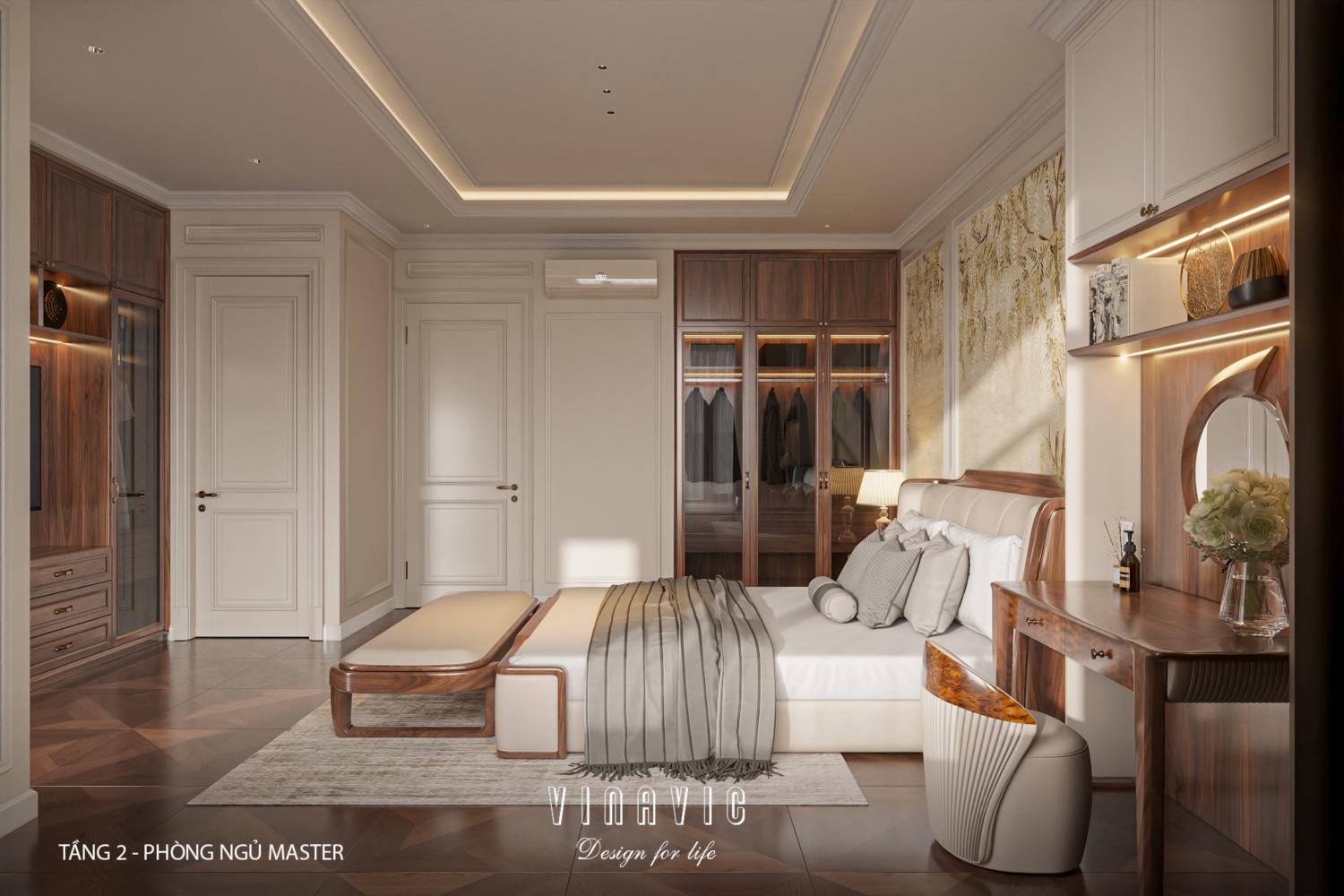 Phòng ngủ Master (Tầng 2): Tiếp tục sử dụng vật liệu gỗ óc chó chủ đạo. Sàn gỗ xương cá thời thượng. Giường ngủ bọc nệm, phía sau là vách ốp tường bọc giấy dán tường họa tiết vàng kim tinh tế. Tủ quần áo cửa kính trong suốt có đèn hắt, bàn trang điểm và kệ TV đều được thiết kế đồng bộ.