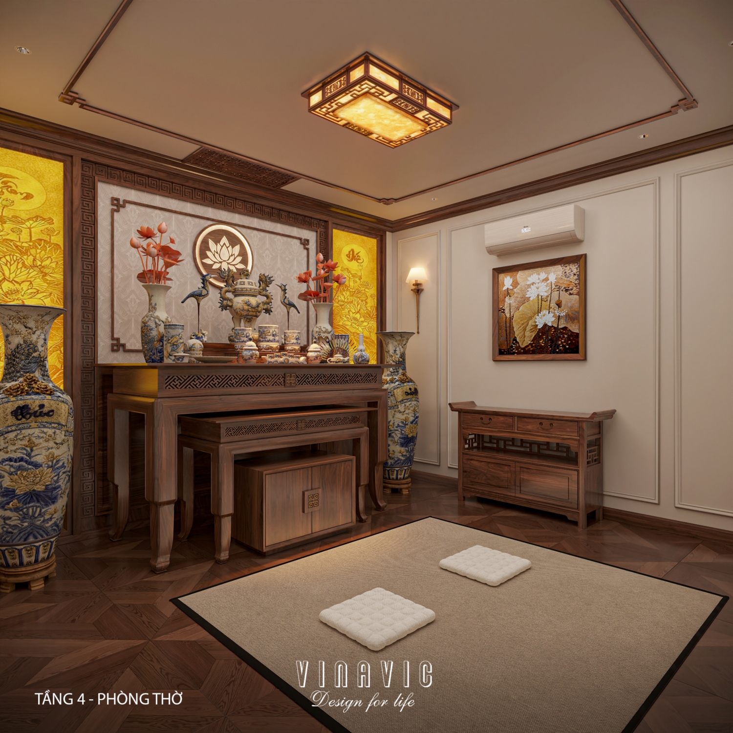 Phòng thờ: Thiết kế vô cùng trang nghiêm, thành kính. Toàn bộ không gian sử dụng gỗ tự nhiên sẫm màu. Ban thờ được chạm khắc hoa văn truyền thống, đặt ở vị trí trung tâm. Phía sau ban thờ là vách ốp CNC họa tiết hoa sen - biểu tượng của sự thanh tịnh. Hai bên là các bức vách trang trí hoa văn cổ và lục bình gốm sứ. Ánh sáng vàng ấm từ đèn trần gỗ và đèn tường tạo nên một không khí trang trọng, ấm cúng, đúng với tinh thần "uống nước nhớ nguồn" của người Việt.