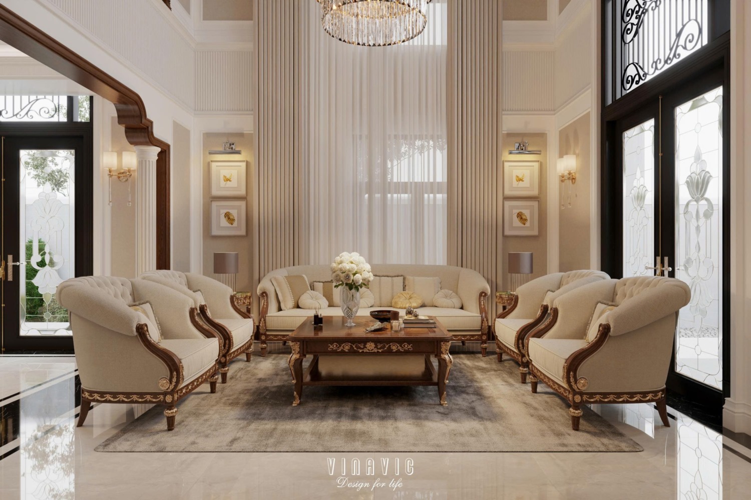 Dự án NT2368 sử dụng gam màu trắng kem, be và ánh kim tinh tế, tạo nên tổng thể sang trọng và đẳng cấp về phong cách. Sự phối hợp hài hòa giúp không gian phòng khách tân cổ điển trở nên nổi bật, đúng chuẩn tân cổ điển đẹp.