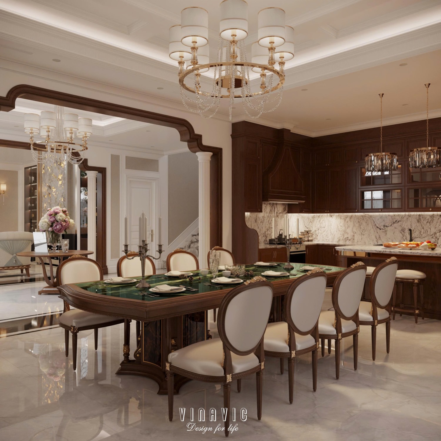 Khu bếp và sinh hoạt chung được thiết kế mở, tăng sự kết nối. Không gian vẫn giữ được nét tân cổ điển đẹp, tiện nghi và ấm cúng.