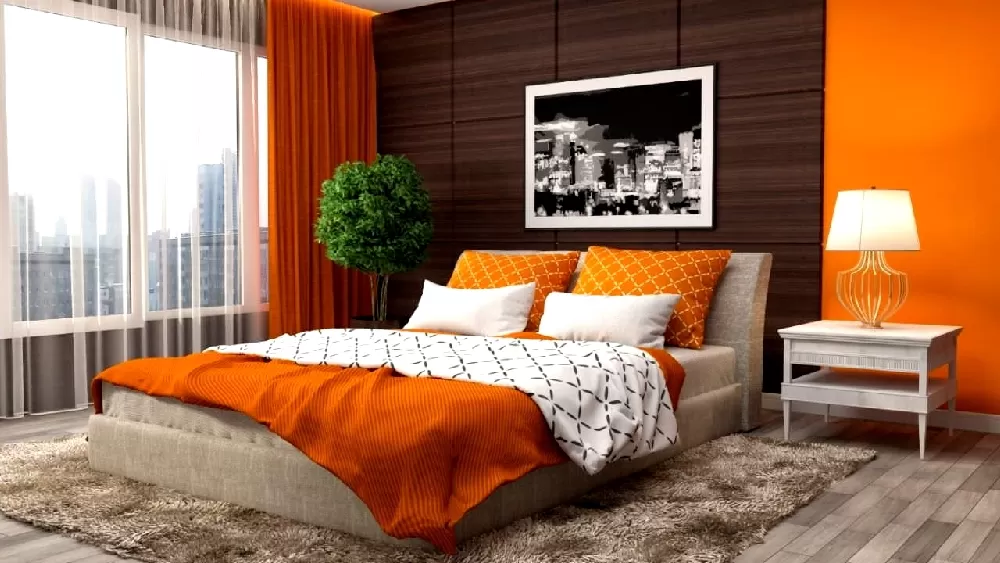 Màu cam (tường chính) + màu vàng (tường phụ) + màu nâu (đồ nội thất)