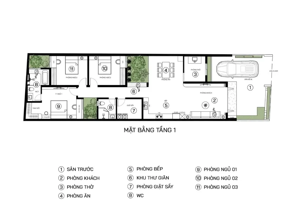 - Sân trước (3m): Làm khu vực để xe máy và tiểu cảnh, tạo khoảng lùi giảm ồn, giảm bụi.